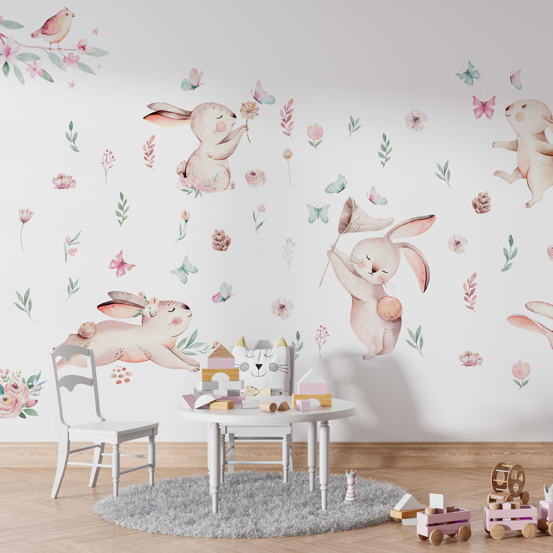 Premeňte svoj priestor pomocou tejto rozkošnej nástennej maľby s rozkošnou skupinou králikov, ktorí sa preháňajú medzi kvetmi a motýľmi. Predstavte si, že vstúpite do miestnosti, kde tieto veselé zvieratká akoby tancovali priamo zo steny a každé z nich má hravé čaro, ktorému je ťažké odolať. Jemné farby a rozmarný dizajn prinášajú ľahký nádych, takže je ideálny pre útulnú detskú izbu alebo veselú herňu. Je ako jemné objatie prírody, ktoré pozýva do atmosféry teplo a radosť. A kto by mohol odmietnuť malé zajačie šibalstvo, zatiaľ čo popíjate rannú kávu? Určite vyvolá rozhovory a úsmevy – ideálny pre každého, kto hľadá jedinečný dekoračný kúsok, ktorý pôsobí priateľsky a zábavne.