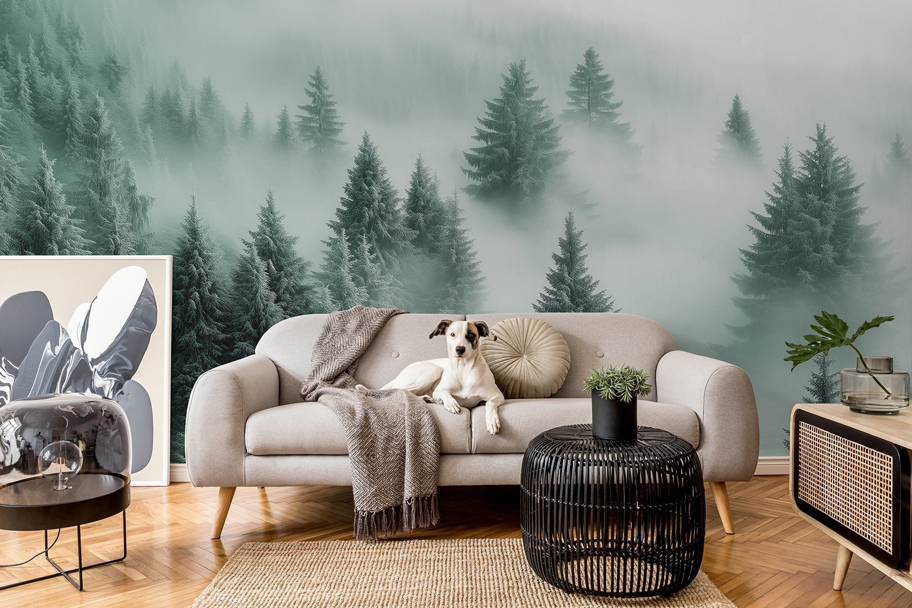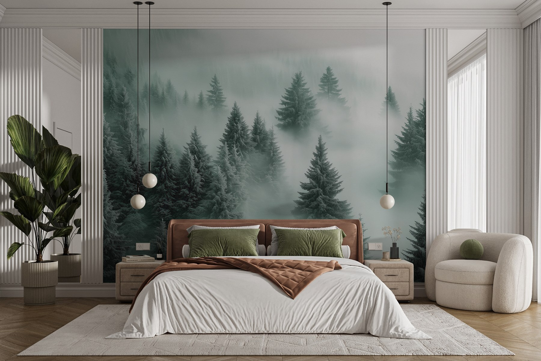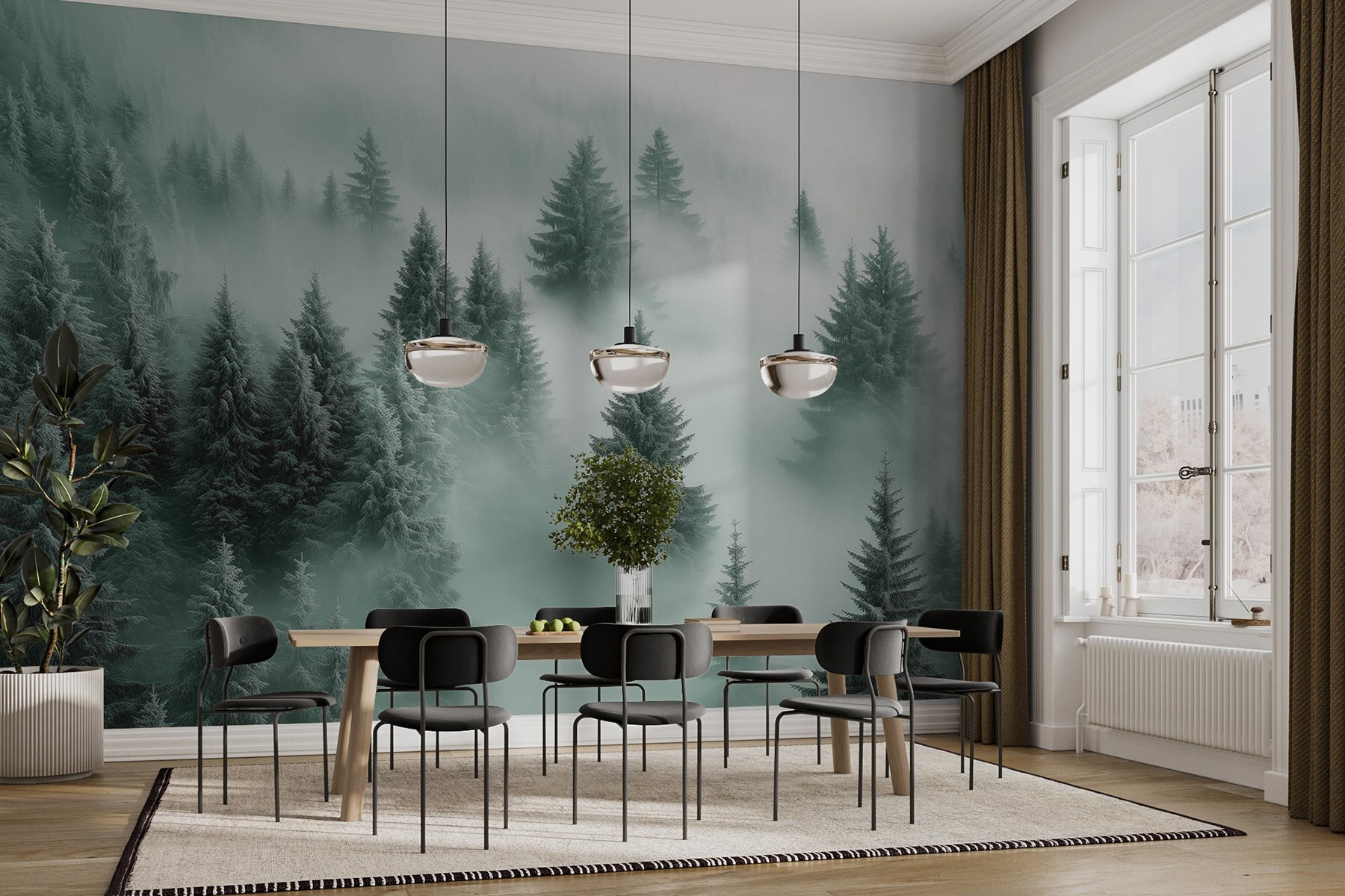 Predstavte si, že vstúpite do útulnej chaty, kde je teplo a príjemne, a potom vás privíta táto úžasná nástenná maľba stromov v hmle. Je to ako preniesť prírodu priamo do vašej obývačky, ale bez rizika, že vám večierok naruší veverička. Jemná zeleň a hmlisté vibrácie dodávajú všetkému pokoj a pohodu, ideálne na lenivé nedele alebo po dlhom dni. Predstavte si, ako sa usadíte s dobrou knihou, dokonalou šálkou čaju v ruke a stratíte sa v tejto zasnenej krajine. Je to aj podnet na konverzáciu – hostí to určite zaujme. Je to čarovný les? Tajomný portál? Rozhodnite sa sami. Pridanie tejto nástennej maľby je ako zdieľanie malého kúska pokoja s každým, kto vstúpi do vášho priestoru.