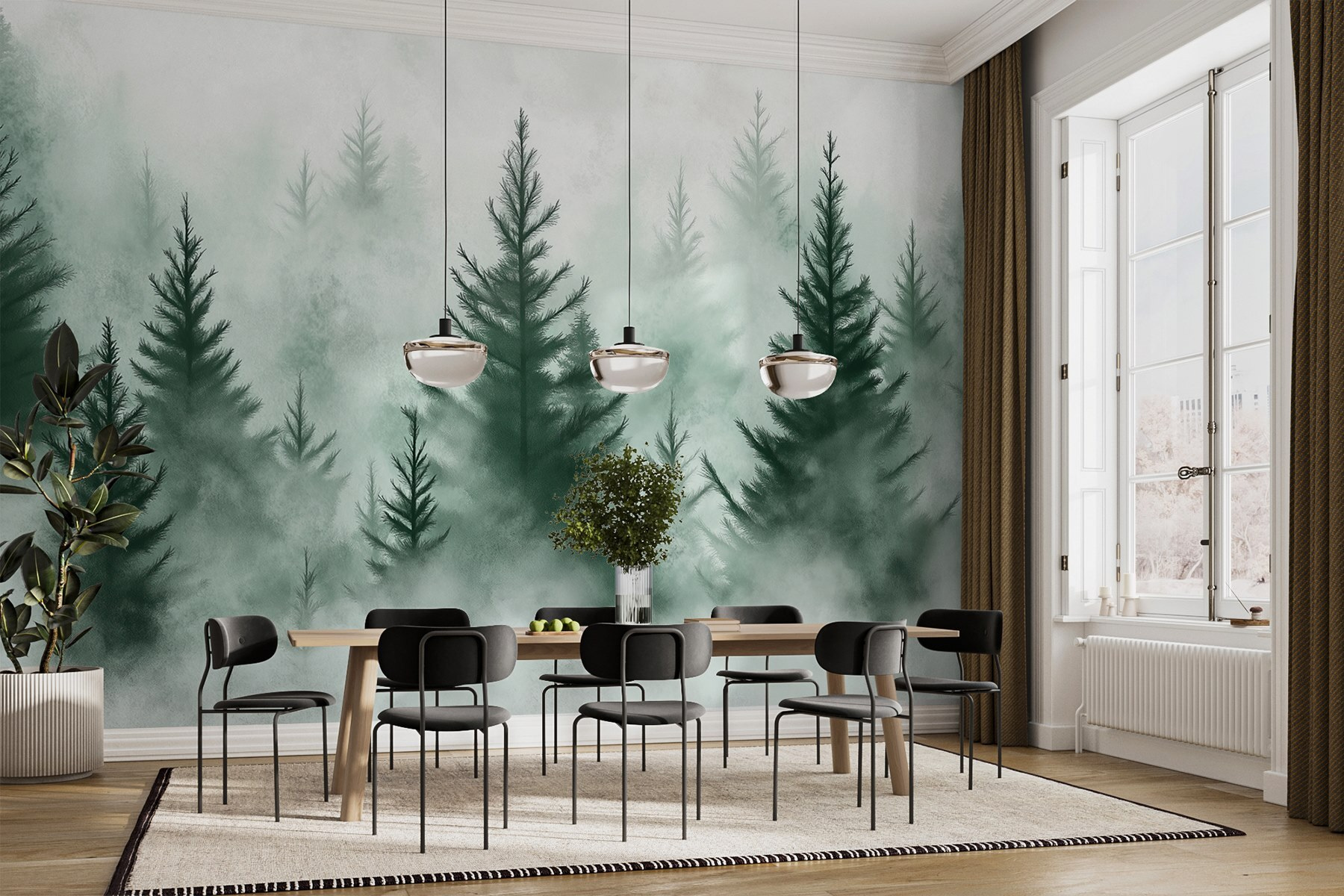 Pomocou nástennej maľby “Skupina stromov v hmle” premeníte akýkoľvek priestor na pokojné útočisko. Predstavte si, že sa prebúdzate do pokojnej krásy hmlistých lesov – je to ako horské útočisko priamo u vás doma. Táto fototapeta vás vtiahne svojimi jemnými zelenými odtieňmi a snovými vibráciami, vďaka ktorým sa každá miestnosť bude cítiť otvorene a pokojne. Je ideálna pre útulný čitateľský kútik alebo aj pre tú prázdnu stenu, ktorá si priam žiada charakter. Navyše, kto by nemal rád dotyk prírody, ktorý si nevyžaduje zalievanie? Stačí ho zavesiť, odstúpiť a nechať sa unášať pokojom ako jemný vánok. Ideálne pre snívajúcich ľudí aj milovníkov prírody!