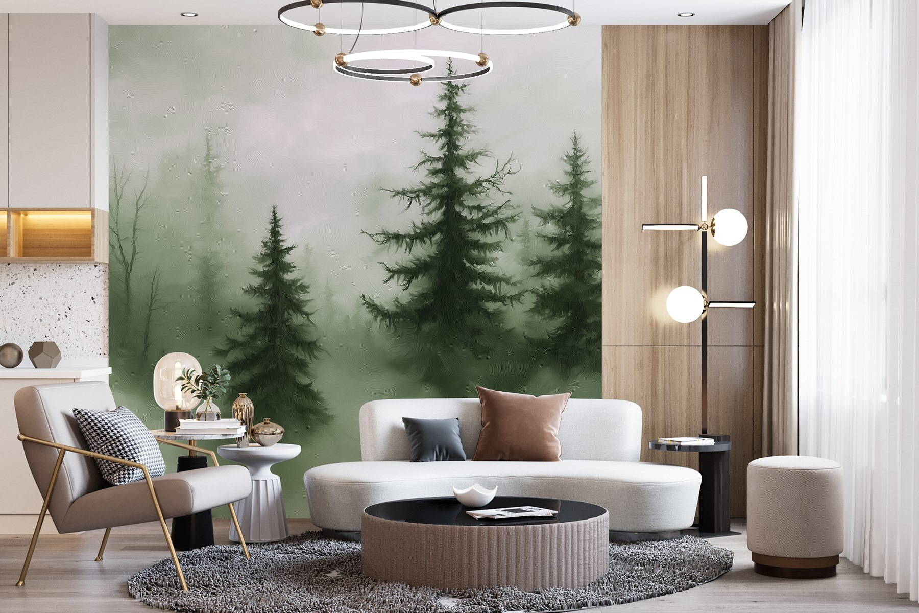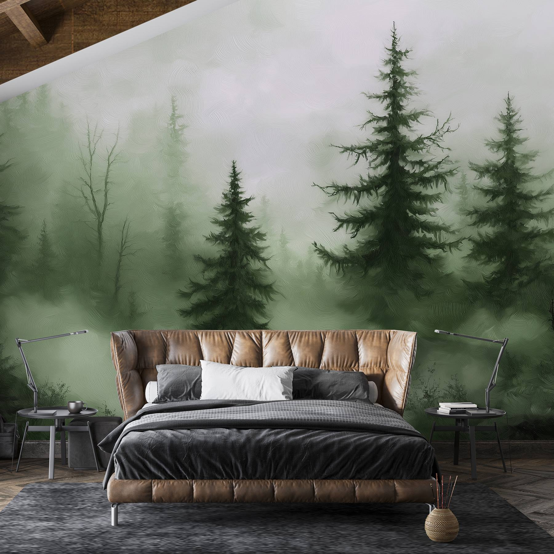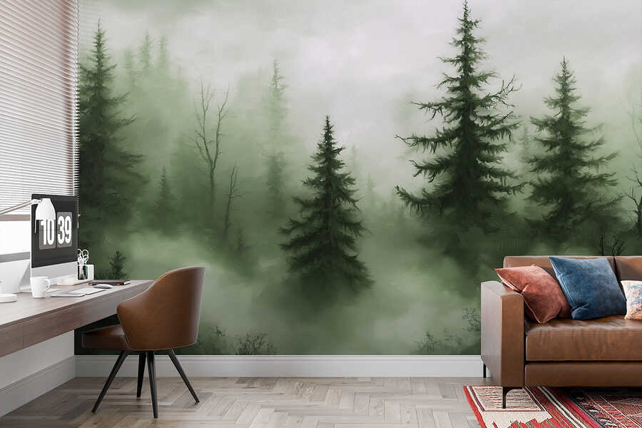 Vstúpte do zasneného úniku s nástennou maľbou “Hmlistý les so stromami”. Predstavte si, že popíjate rannú kávu obklopení pokojným hmlistým lesom, v ktorom tie vysoké stromy akoby šepkali tajomstvá. Tento dizajn prináša kúsok prírody priamo do vášho domova – ideálny na vytvorenie útulného zákutia alebo pokojného útočiska. Tlmená zeleň a jemné textúry navodzujú pokojné vibrácie, takmer ako objatie od matky prírody. Navyše nepotrebujete turistické topánky ani sprej proti hmyzu! Stačí sa pohodlne usadiť, relaxovať a nechať svoje steny hovoriť.