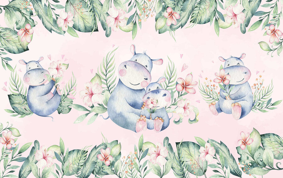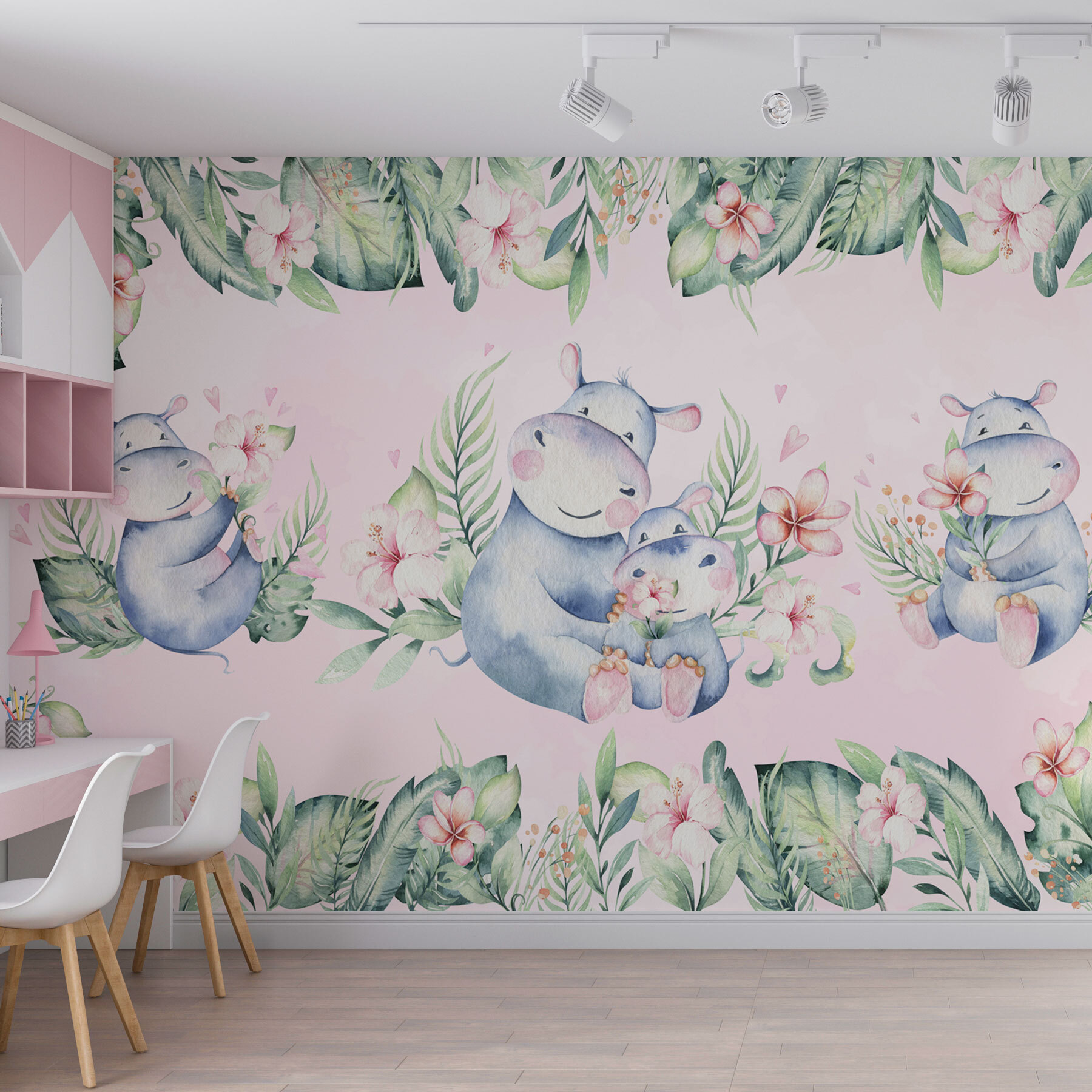Premeňte svoj priestor pomocou tejto rozkošnej nástennej maľby, ktorá zobrazuje očarujúce akvarelové hrochy usadené medzi živými kvetmi. Predstavte si, že vojdete do miestnosti, kde sa tieto rozkošné stvorenia akoby chichotali a objímali krásu prírody, čím vám okamžite zlepšia náladu. Táto nástenná maľba je ideálna do detských izieb alebo hravých priestorov a dodáva im veselú atmosféru, ktorá šepká radosť. Vďaka upokojujúcemu ružovému pozadiu pôsobí hrejivo a prívetivo. Je to ako mať kúsok savany priamo u vás doma, kde každý pohľad vyvoláva úsmev – kto by to nechcel? Navyše by mohol inšpirovať k zábavným chvíľam pri rozprávaní príbehov!
