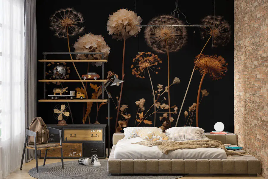 Premeňte akúkoľvek miestnosť na rozmarnú záhradu s touto úžasnou nástennou maľbou púpav tancujúcich na svojich stonkách. Jemné odtiene a žiarivé detaily vás vtiahnu do sveta, kde priania vzlietajú s každým vánkom. Predstavte si, že popíjate čaj, pozeráte na túto nástennú maľbu a strácate sa v snoch o slnku a piknikoch. Je to ako priniesť do interiéru dotyk prírody bez peľových alergií. Ideálna na oživenie útulného zákutia alebo dodanie šmrncu živému priestoru, pozýva do vášho domova teplo a kúsok kúzla. Kto by nechcel mať na stene kúsok čara divokých kvetov?