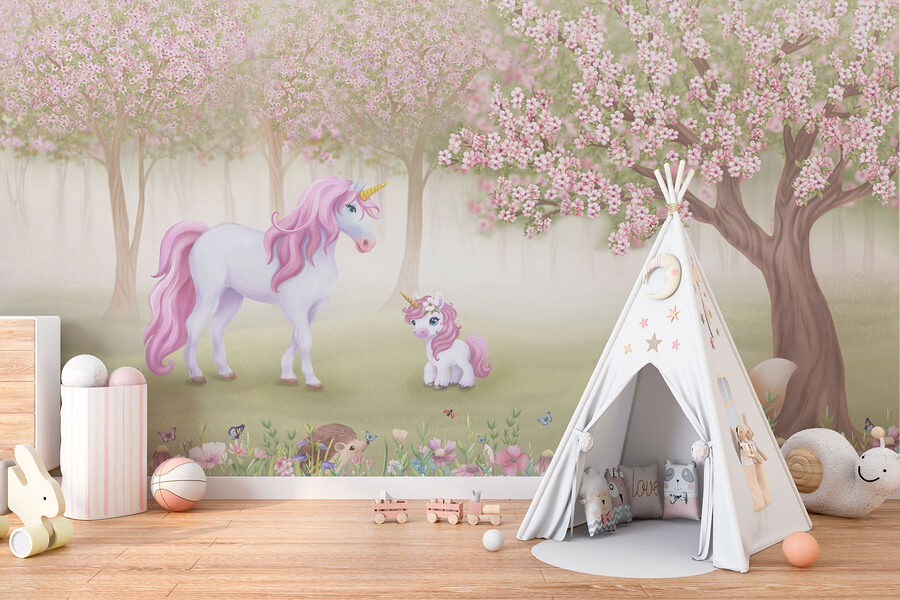 Premeňte každú miestnosť na rozmarnú krajinu zázrakov s touto očarujúcou nástennou maľbou s jednorožcom a jeho chlpatými priateľmi. Predstavte si jemné ružové kvety, ktoré sa jemne kolíšu a napĺňajú vzduch sladkosťou – ideálne na rozžiarenie radosti každý deň. Duo jednorožcov a rozkošných lesných zvieratiek nabáda k jemnej, hravej energii, ktorej je ťažké odolať. Predstavte si príjemné popoludnia strávené čítaním alebo snívaním, pričom krása prírody je vzdialená len na pohľad. Táto nástenná maľba nie je len dekoráciou – rozpráva príbeh a prináša teplo a kúzlo na steny, ktoré by potrebovali trochu rozveseliť. Ideálna do detských priestorov alebo pre každého, kto je mladý srdcom!
