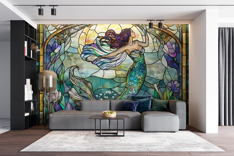 Ponorte sa do farebného podmorského sveta s touto nástennou maľbou s úžasnou vitrážou morskej panny. Predstavte si, ako popíjate rannú kávu a pritom sa kocháte radostnými odtieňmi oceánskej modrej a zelenej, ktoré sa rozlievajú po stenách. Jemné víry a plynulé línie vytvárajú pocit pokoja, ktorý zjemní každý priestor. Predstavte si útulné filmové večery s priateľmi, pri ktorých všetkých priťahuje magické čaro morskej panny. Táto nástenná maľba nielen zdobí miestnosť, ale pozýva do každodenného života príbehy, sny a nádych rozmarnosti. Ideálna pre milovníkov prírody alebo pre každého, kto chce mať doma nádych mora.