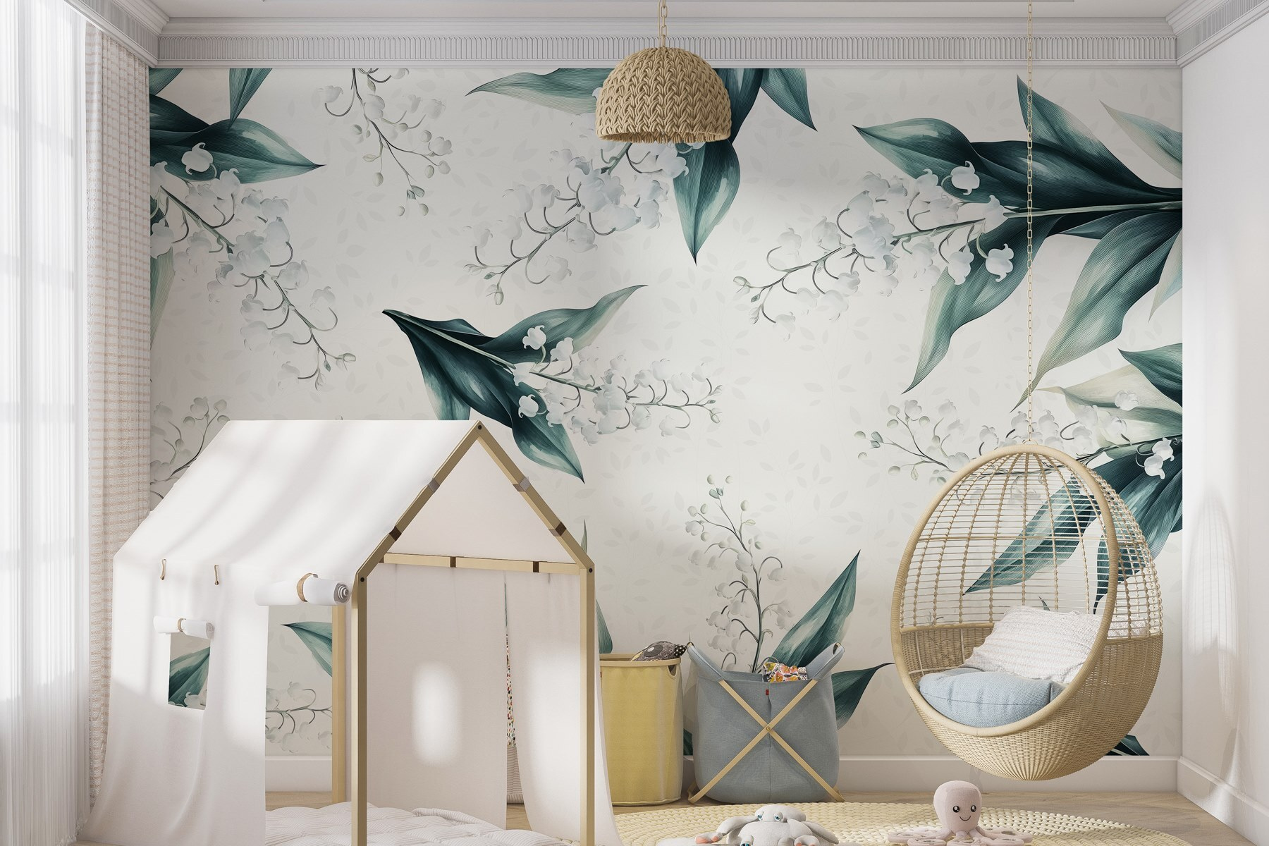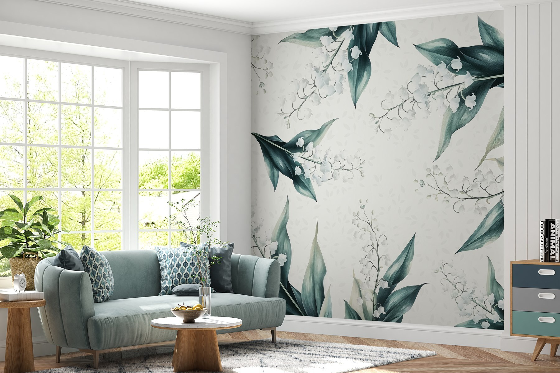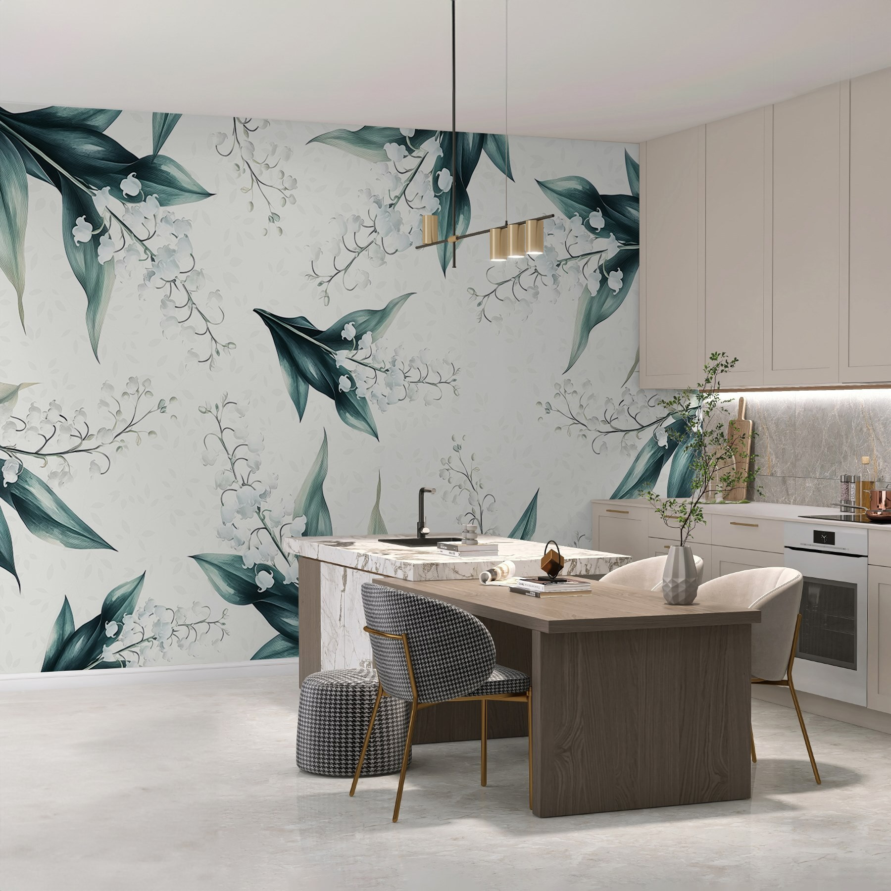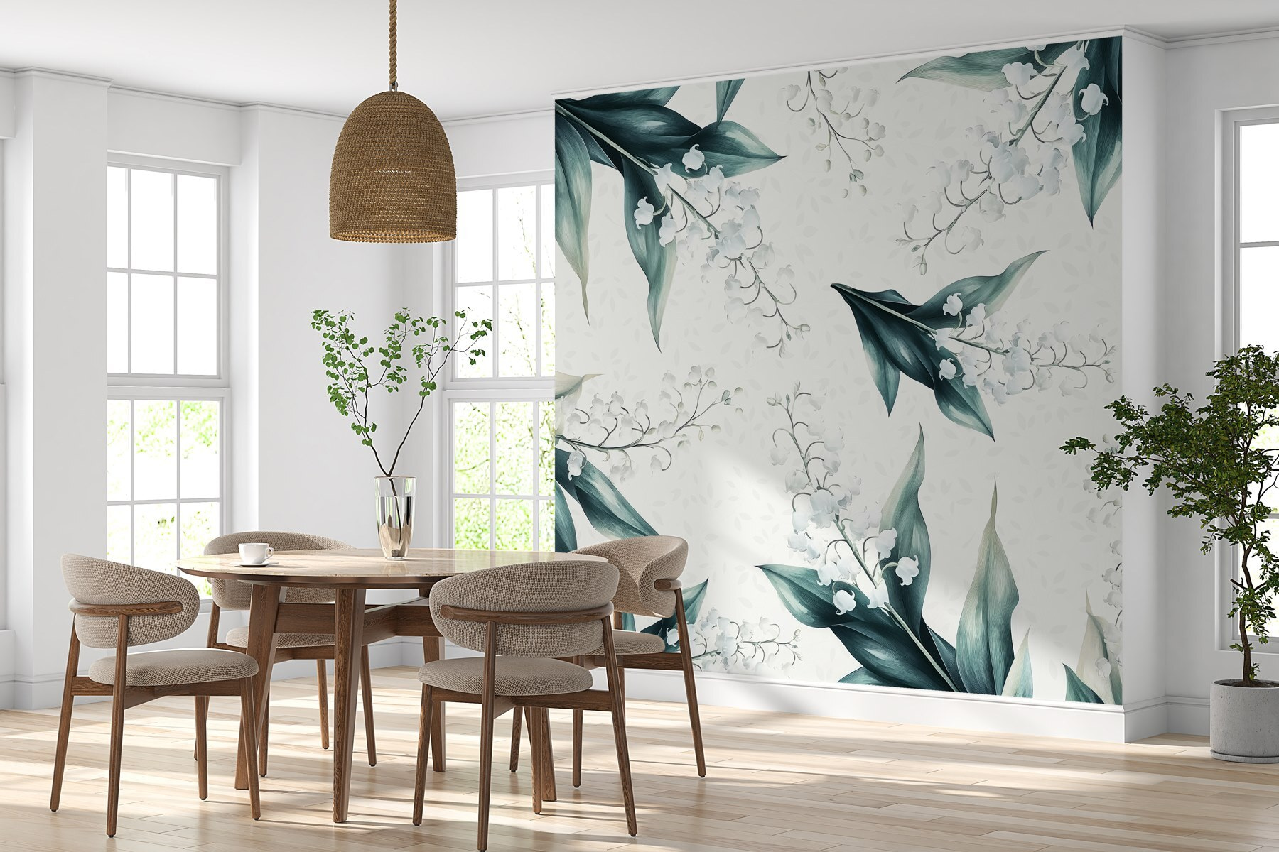 Pomocou nástennej maľby “Vzor kvetov a listov” premeníte každú miestnosť na oázu pokoja. Predstavte si to: prebudenie obklopené jemnými okvetnými lístkami a sviežou zeleňou, kde vás príroda pozýva dovnútra! Jemný akvarelový štýl dodáva nežný nádych, vďaka ktorému tieto biele kvety takmer šepkajú sladké tóny. Je to ako preniesť si záhradu do interiéru bez polievacích kanvíc a otravného hmyzu. Táto nástenná maľba, ideálna do útulného čitateľského kútika alebo živej kuchyne, vyvoláva radosť a rozhovory – kto by nemiloval kvetinové rozhovory pri káve? Ponorte sa do náručia prírody a pocíťte, ako hladina stresu klesá!