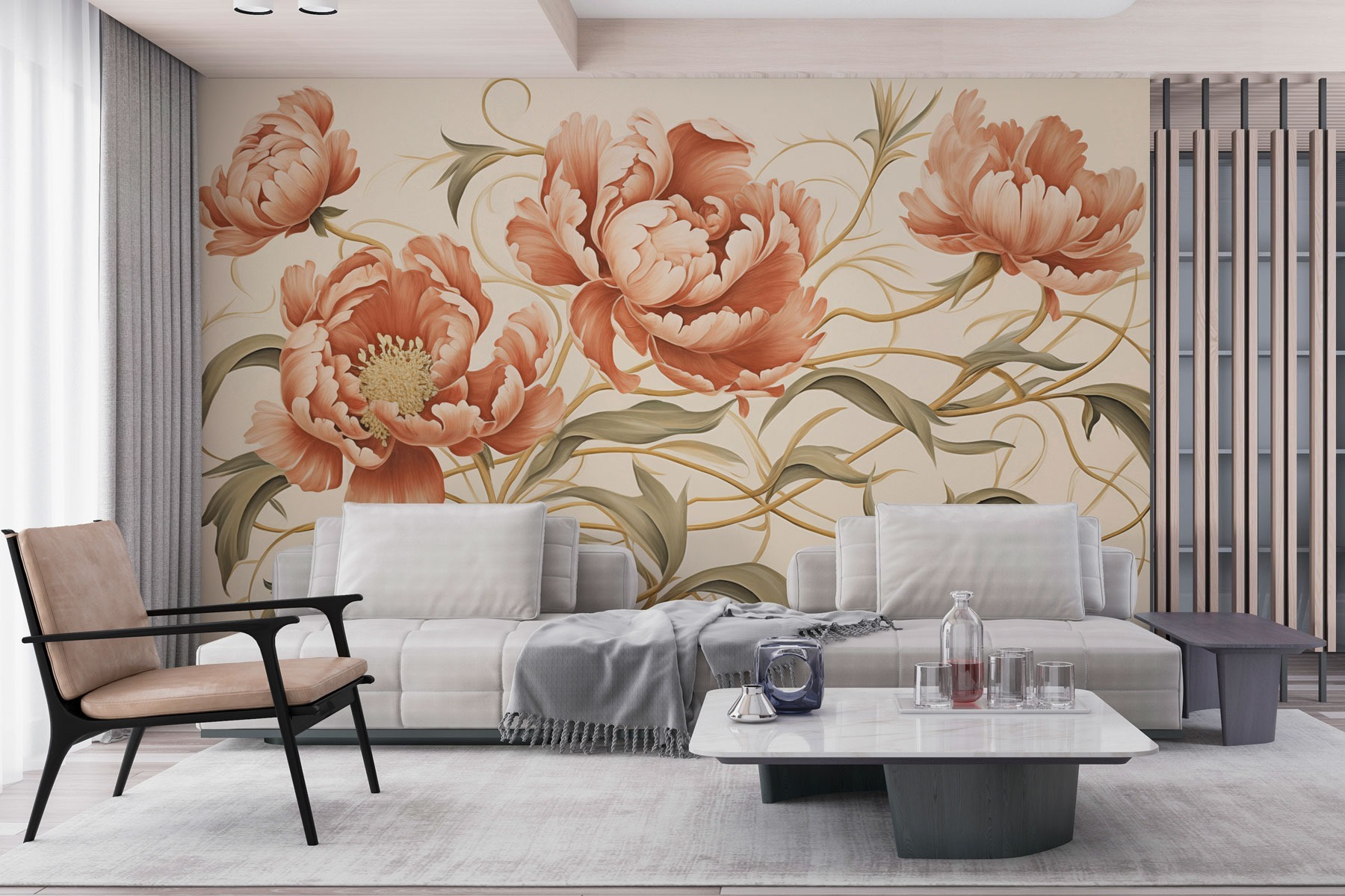 Premeňte akúkoľvek miestnosť na útulné botanické útočisko pomocou tejto úžasnej nástennej maľby s kvetmi a viničom. Predstavte si to – slnečné svetlo prúdi dovnútra a tieto nádherné pivonky v jemných ružových a broskyňových odtieňoch tancujú na teplom pozadí. Je to ako preniesť si malú záhradku do interiéru bez starostí so zalievaním!