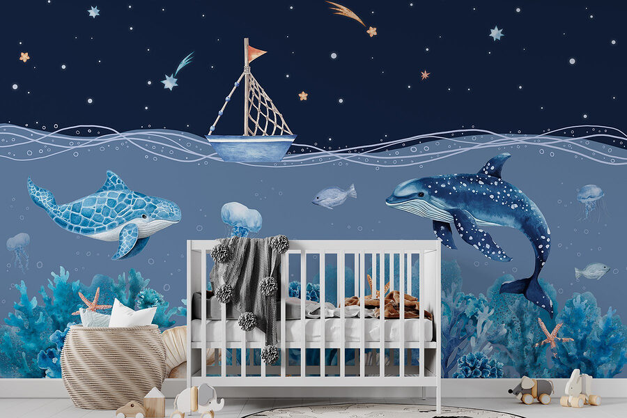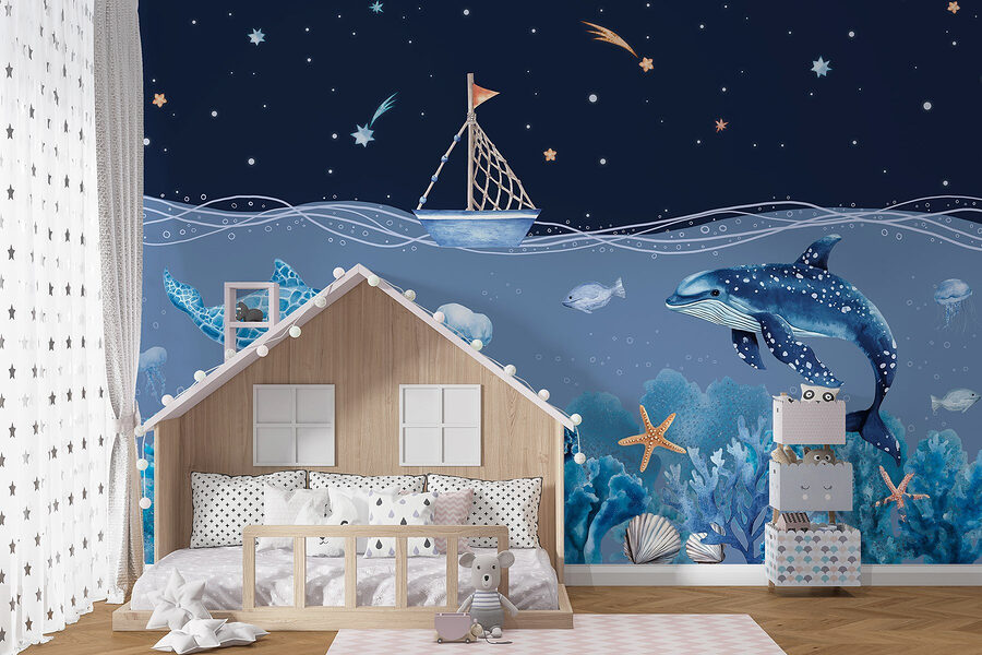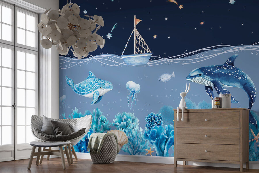 Premeňte akúkoľvek miestnosť na pokojný podmorský únik s nástennou maľbou “Sea Life s loďou a veľrybou”. Predstavte si hravú veľrybu, ktorá sa plaví po zasnenom mori, zatiaľ čo nad ňou pláva očarujúca loďka. Je to ako mať kúsok oceánu priamo na stene. Chladná modrá a jemná zelená zahaľujú priestor do upokojujúceho objatia, vďaka čomu sa ranná káva bude zdať ako chvíľa v raji. Táto nástenná maľba je ideálna do detskej izby alebo do útulného čitateľského kútika a určite podnieti fantáziu. Bonusové body za rozprávanie príbehov – kto by sa nechcel ponoriť do príbehov o dobrodružstve na šírom mori? Ponorte sa a nechajte svoje steny ožiť!