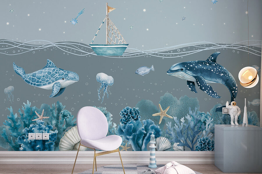 Premeňte svoj priestor na pokojné podmorské útočisko s nástennou maľbou “Sea Life”. Predstavte si, že sa každý deň prebúdzate a na stenách vám tancujú hravé delfíny a nežné medúzy. Tento snový výjav zachytáva očarujúcu malú loďku kĺzajúcu sa po pokojnom mori, obklopenú žiarivými koralmi a morskými hviezdicami. Je to ako mať doma kúsok oceánu – bez slaných vlasov! Táto nástenná maľba, ktorá je ideálna do detskej izby alebo aj do útulného čitateľského kútika, prináša nádych rozmarnosti a pokoja. Nechajte sa unášať farbami, ktoré vytvárajú pokojnú atmosféru, ktorá môže inšpirovať k snívaniu o oceánskych dobrodružstvách.