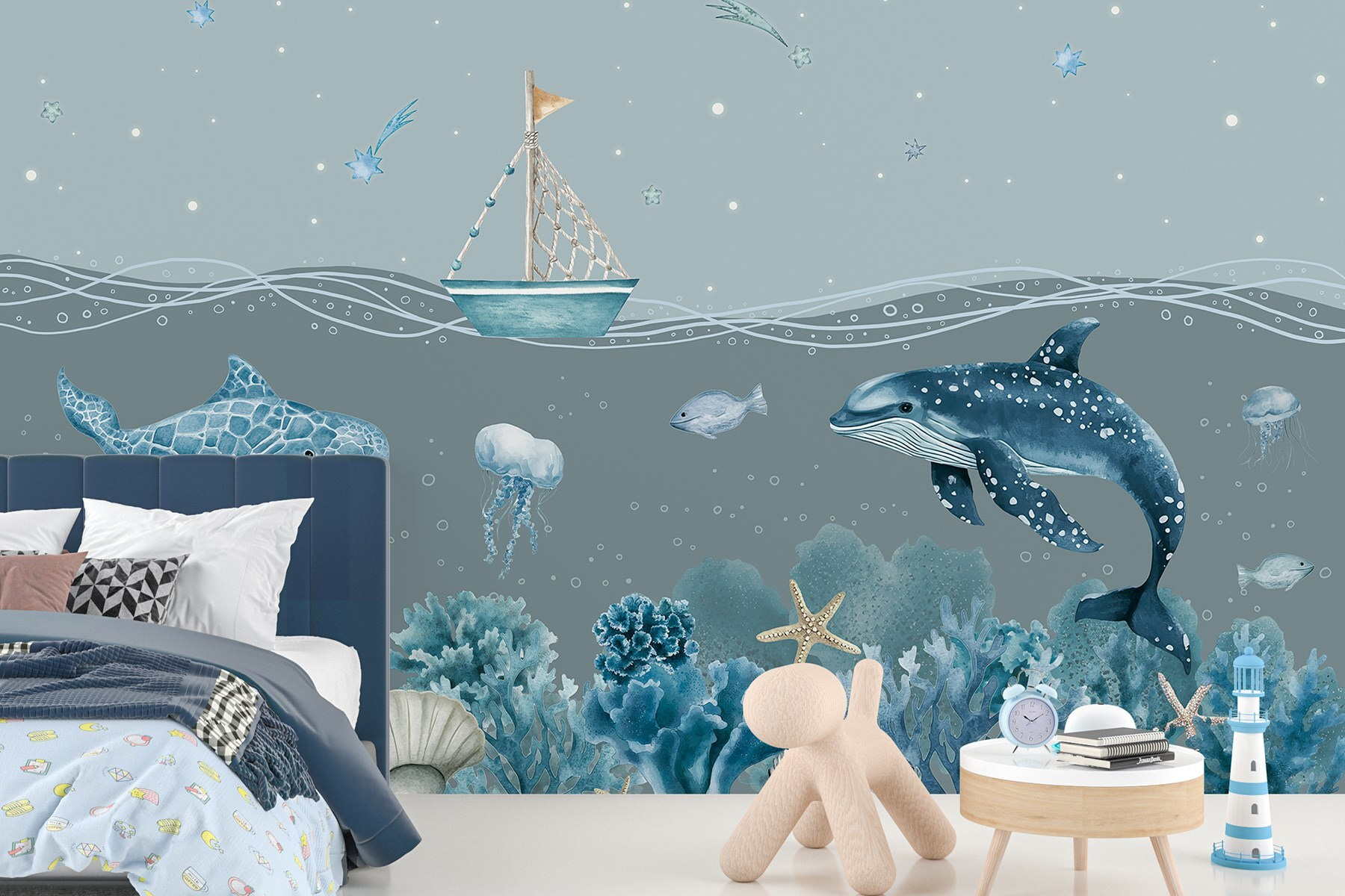 Premeňte svoj priestor na pokojné podmorské útočisko s nástennou maľbou “Sea Life”. Predstavte si, že sa každý deň prebúdzate a na stenách vám tancujú hravé delfíny a nežné medúzy. Tento snový výjav zachytáva očarujúcu malú loďku kĺzajúcu sa po pokojnom mori, obklopenú žiarivými koralmi a morskými hviezdicami. Je to ako mať doma kúsok oceánu – bez slaných vlasov! Táto nástenná maľba, ktorá je ideálna do detskej izby alebo aj do útulného čitateľského kútika, prináša nádych rozmarnosti a pokoja. Nechajte sa unášať farbami, ktoré vytvárajú pokojnú atmosféru, ktorá môže inšpirovať k snívaniu o oceánskych dobrodružstvách.