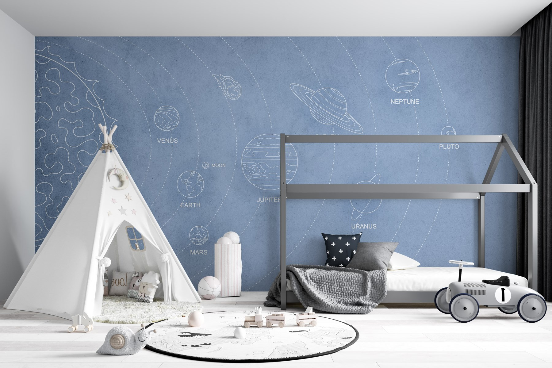 S touto očarujúcou fototapetou zobrazujúcou planéty našej slnečnej sústavy premeníte každý priestor na vesmírnu krajinu zázrakov. Predstavte si, že sa každý deň zobudíte s úžasnou ilustráciou Merkúra, Venuše a dokonca aj Pluta – áno, Pluto je stále pozvaný na párty! Jemné modré pozadie nabáda k pocitu pokoja, zatiaľ čo hravá grafika prináša nádych rozmarnosti. Ideálne do detských izieb alebo pre každého, kto miluje hviezdy. Podnieti zvedavosť a prenesie vás do iného sveta, kde je dobrodružstvo vzdialené len na pohľad. Je to viac než dekorácia, je to každodenná dávka inšpirácie!