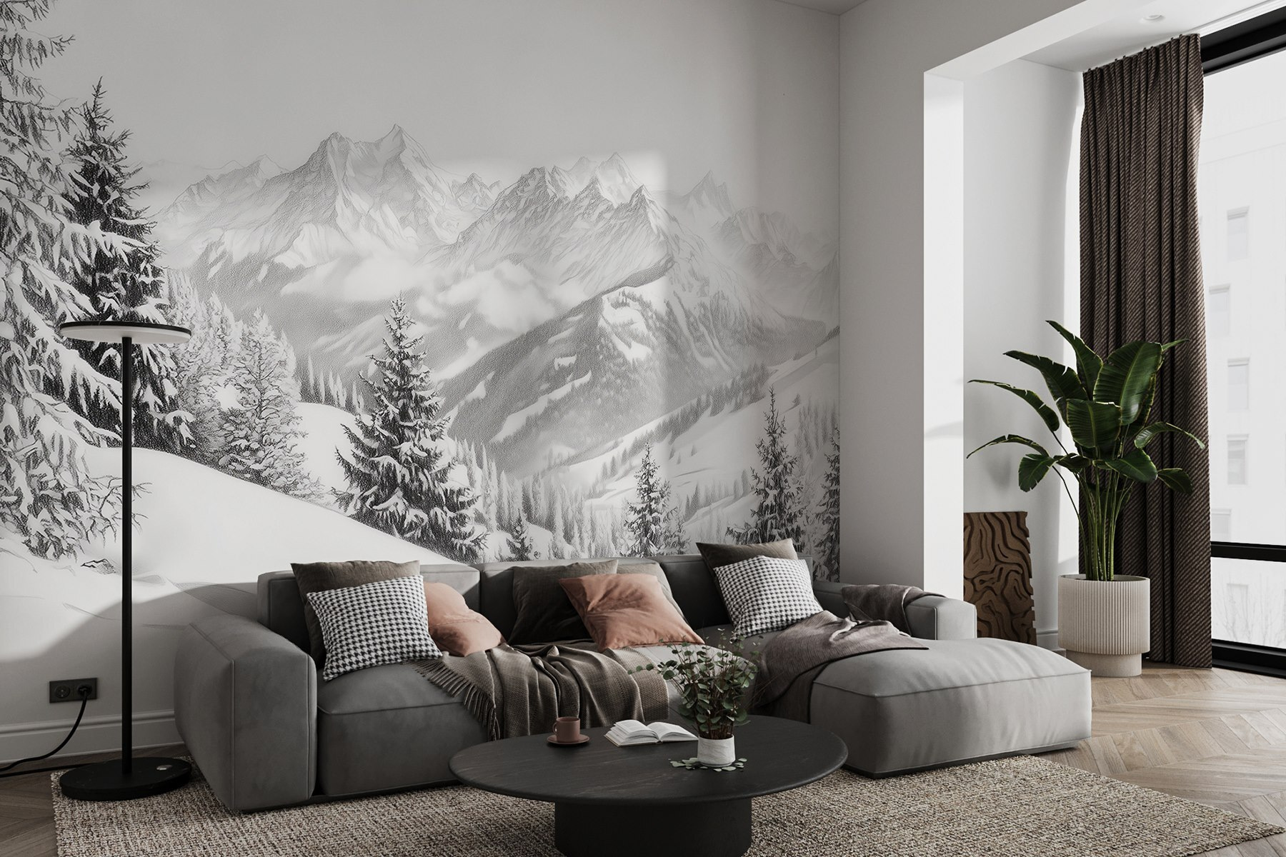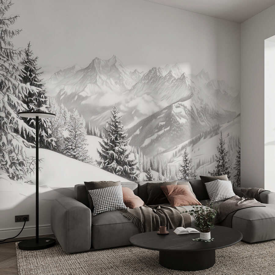 Premeňte akúkoľvek miestnosť na pokojné zimné útočisko s touto úžasnou nástennou maľbou zasnežených hôr a majestátnych stromov. Predstavte si, ako sa uvelebujete s horúcim nápojom a hľadíte na úchvatnú krajinu, ktorá je akoby na dosah ruky. Pokojná biela a jemná sivá farba navodzujú pokoj, ktorý vás obklopí ako teplá prikrývka – ideálna na chladné noci. Dodajte svojim stenám nádych divočiny a nechajte svoj priestor dýchať čerstvým horským vzduchom. Táto nástenná maľba, ideálna pre milovníkov prírody aj snívajúcich, nabáda k pokojným myšlienkam a pocitu dobrodružstva aj z gauča.