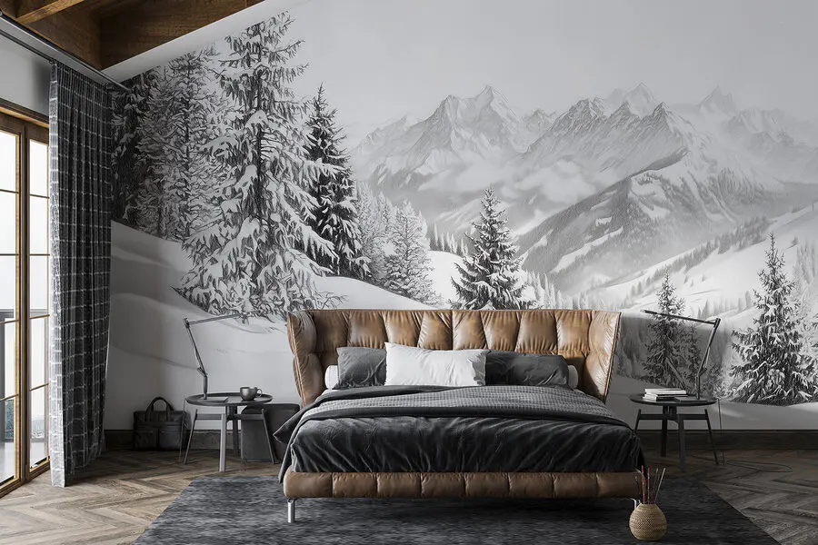 Premeňte akúkoľvek miestnosť na pokojné zimné útočisko s touto úžasnou nástennou maľbou zasnežených hôr a majestátnych stromov. Predstavte si, ako sa uvelebujete s horúcim nápojom a hľadíte na úchvatnú krajinu, ktorá je akoby na dosah ruky. Pokojná biela a jemná sivá farba navodzujú pokoj, ktorý vás obklopí ako teplá prikrývka – ideálna na chladné noci. Dodajte svojim stenám nádych divočiny a nechajte svoj priestor dýchať čerstvým horským vzduchom. Táto nástenná maľba, ideálna pre milovníkov prírody aj snívajúcich, nabáda k pokojným myšlienkam a pocitu dobrodružstva aj z gauča.
