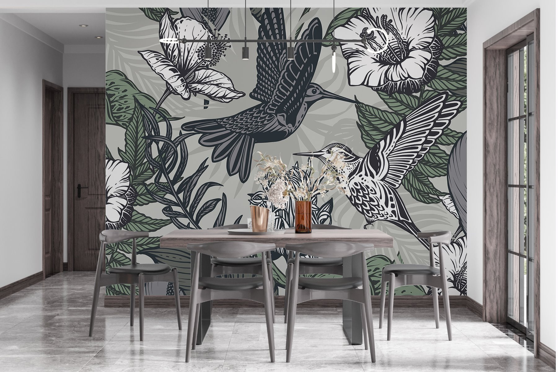 Premeňte akýkoľvek priestor na pokojné útočisko pomocou nástennej maľby “Vták letiaci nad kvetmi”. Predstavte si to: živé vtáky ladne poletujúce uprostred sviežej, rozkvitnutej flóry, ktoré pozývajú prírodu priamo k vám domov. Je to ako mať na stene kúsok raja – kto by to nechcel?