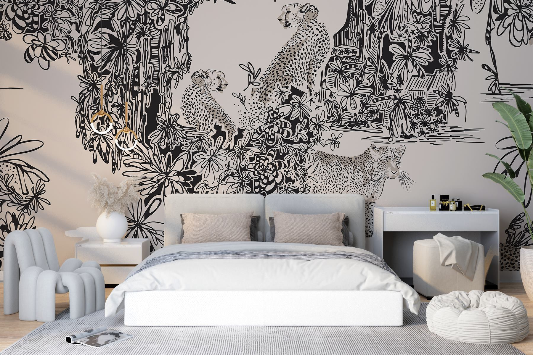 Premeňte svoj priestor na divoké útočisko pomocou tejto úžasnej nástennej maľby s pôvabnými gepardmi medzi sviežimi rastlinami. Predstavte si, že vstúpite do miestnosti, ktorá pripomína slnkom zaliatu džungľu, kde pri každom pohľade uvidíte tieto elegantné mačkovité šelmy leňošiace vo svojom prirodzenom prostredí. Zložitý dizajn dodáva rozmarný nádych, takže je ideálny pre každého, kto miluje krásu prírody s nádychom. Predstavte si, ako hostíte priateľov, zatiaľ čo obdivujú toto jedinečné pozadie a rozprúdia rozhovory o dobrodružstvách v divočine. Je to ako mať doma safari – bez dlhého letu! Či už ide o útulnú pracovňu alebo živú detskú izbu, táto nástenná maľba rozpráva príbeh plný elegancie a dobrodružstva a prináša kúsok tropov priamo na vaše steny.