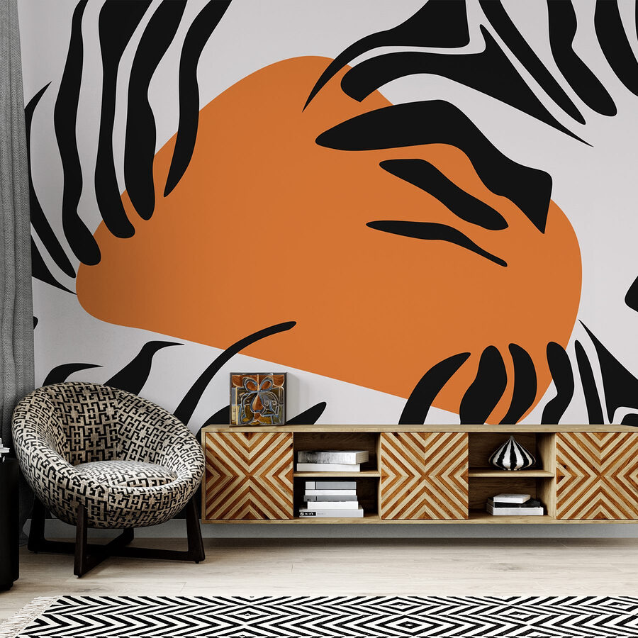 Premena priestoru môže niekedy pripomínať kúzelnícky trik a táto nástenná maľba to dokáže. “Dynamické vzory v odvážnych farbách” rozprúdia energickú atmosféru, ktorá prinúti každého urobiť dvojitý záber. Predstavte si živé čiernobiele pruhy prepletené s kvapkou žiarivej oranžovej – akoby vás dielo pozývalo na hravú džungľovú párty priamo vo vašej obývačke.
