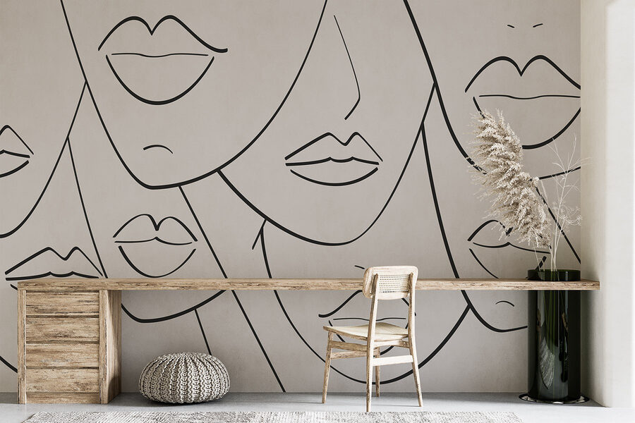 Premeňte svoj priestor pomocou tejto podmanivej nástennej maľby so skupinou abstraktných tvárí, z ktorých každá má jedinečne nakreslené pery v pôsobivej čiernobielej farbe. Nie je to len dekorácia, ale aj podnet na konverzáciu. Predstavte si, že vojdete do miestnosti a privítajú vás tieto zaujímavé výrazy, z ktorých každý rozpráva iný príbeh – aká je ich atmosféra, aké tajomstvá skrývajú?