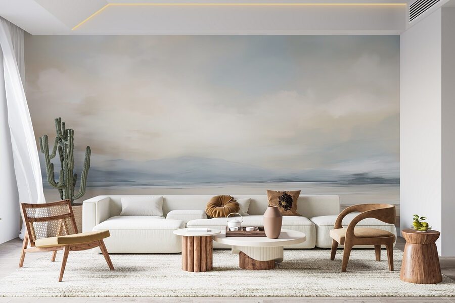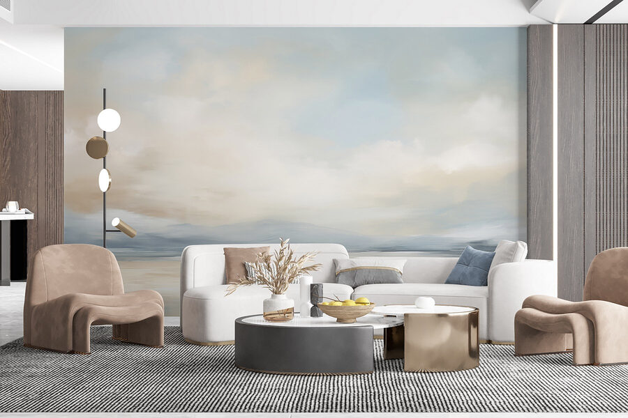 Premeňte svoj priestor pomocou tejto pokojnej nástennej maľby “Krajina s vodnou plochou a mrakmi”. Predstavte si, že vstúpite do miestnosti, kde upokojujúce farby šepkajú pokoj a nad hlavou plávajú jemné oblaky. Táto nástenná maľba vás vtiahne do zasneného prímorského úniku – ideálna, keď doma nemôžete mať ten výhľad na oceán. Predstavte si, ako popíjate kávu, hľadíte na túto rozľahlú, pokojnú krajinu a cítite, ako sa váš stres rozplýva. Je to ako každodenná mini dovolenka! Ideálny do obývacej izby alebo útulného zákutia, ktorý nabáda k relaxácii, konverzácii a možno aj k dennému snívaniu. Kto by to nechcel?