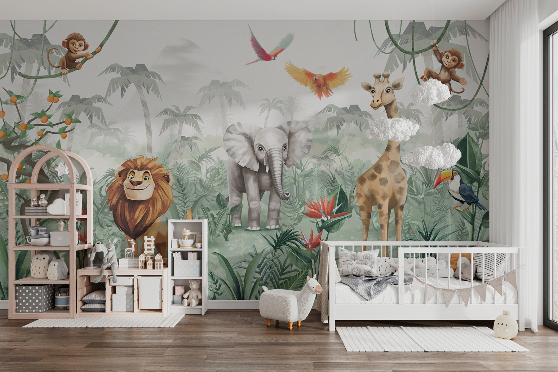 Premeňte akýkoľvek priestor na živé dobrodružstvo v džungli s touto očarujúcou nástennou maľbou! Predstavte si slona a veselého leva, ako šantia medzi priateľmi, ako sú opice a farebné vtáky – je to ako párty na vašej stene! Táto fototapeta prináša pocit radosti a úžasu, je ideálna na podnecovanie predstavivosti detí alebo na pridanie hravého akcentu do každej miestnosti. Predstavte si útulné čitateľské kútiky, v ktorých deti objavujú nové svety, alebo veselé herne, ktoré sa cítia ako na safari. Je to ako pozvať prírodu priamo k vám domov – bez špinavého upratovania!
