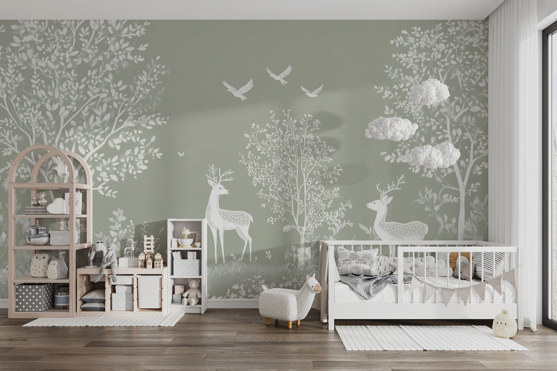 Predstavte si, že vstúpite do pokojného lesa, kde vás nežná krása prírody pozýva k zastaveniu. Táto nástenná maľba s pôvabnými bielymi jeleňmi a hravými vtákmi medzi sviežimi stromami to dokáže – premení každú miestnosť na upokojujúce útočisko. Jemné tóny vytvárajú vzdušný dojem, takže je ideálna do útulných priestorov alebo tichých kútikov na čítanie. Predstavte si, ako popíjate čaj a snívate o lesných dobrodružstvách alebo počúvate šumenie listov. Je to ako preniesť kúsok prírody do interiéru, bez komárov! Jednoduchý spôsob, ako vniesť do každodenného života trochu rozmarnosti a pokoja. Ideálne pre milovníkov prírody alebo pre každého, kto potrebuje trochu úniku.