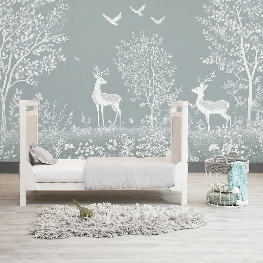 Premeňte svoj priestor na pokojné útočisko s touto očarujúcou nástennou maľbou s pôvabnými bielymi jeleňmi, ktorí sa potulujú v jemnom listnatom lese. Predstavte si, že vstúpite do svojej izby a budete mať pocit, že ste sa zatúlali do zasneného lesa plného jemného šepotu prírody. Jemné vtáčiky poletujúce nad ním dodávajú nádych rozmarnosti, takže je dokonalým pozadím pre útulné večery alebo inšpiratívne rána. Je to ako mať pokojné útočisko priamo doma! Či už popíjate čaj alebo čítate knihu, táto nástenná maľba vyzýva k týmto sladkým malým chvíľam pokoja. Navyše je to skvelý podnet na rozhovor – kto by sa nechcel rozprávať o svojom tajnom lese?