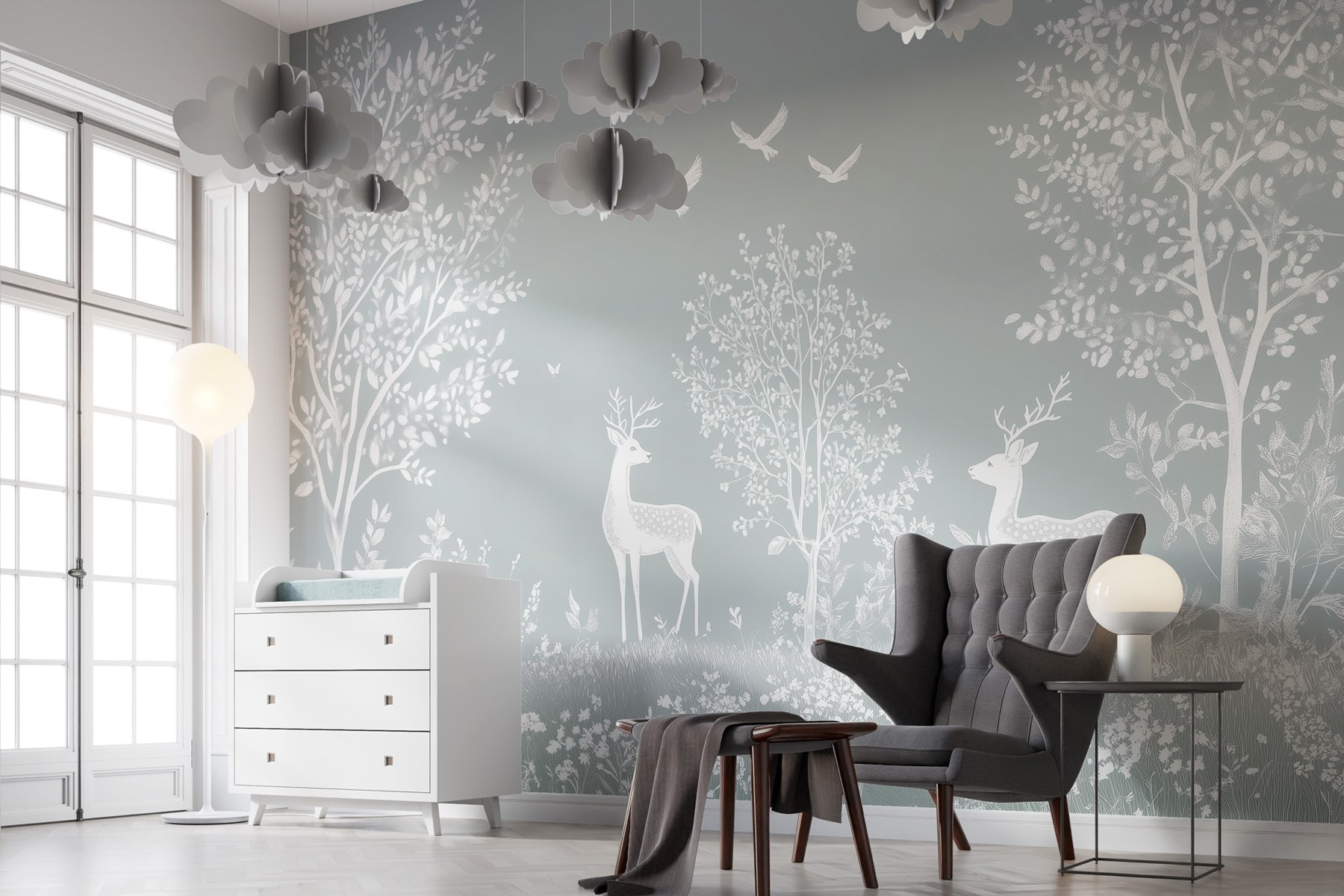 Premeňte svoj priestor na pokojné útočisko s touto očarujúcou nástennou maľbou s pôvabnými bielymi jeleňmi, ktorí sa potulujú v jemnom listnatom lese. Predstavte si, že vstúpite do svojej izby a budete mať pocit, že ste sa zatúlali do zasneného lesa plného jemného šepotu prírody. Jemné vtáčiky poletujúce nad ním dodávajú nádych rozmarnosti, takže je dokonalým pozadím pre útulné večery alebo inšpiratívne rána. Je to ako mať pokojné útočisko priamo doma! Či už popíjate čaj alebo čítate knihu, táto nástenná maľba vyzýva k týmto sladkým malým chvíľam pokoja. Navyše je to skvelý podnet na rozhovor – kto by sa nechcel rozprávať o svojom tajnom lese?