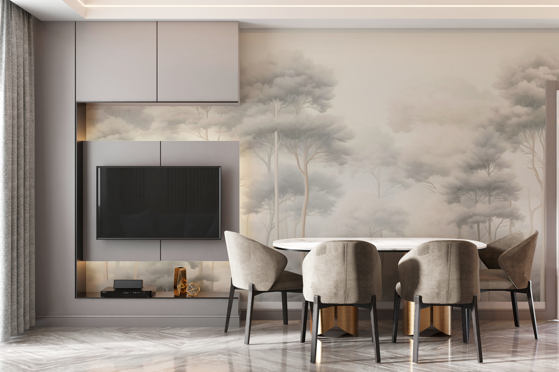 Vstúpte do pokoja s touto úžasnou nástennou maľbou “Skupina stromov v hmlistom lese”. Predstavte si, že sa prebudíte v útulnom zákutí obklopení vysokými stromami, ktorých siluety sú jemne zahalené v hmle. Je to ako pozvať si kúsok prírody priamo k sebe domov – nie sú potrebné turistické topánky! Ideálne pre lenivé rána, keď káva chutí lepšie v pokoji. Jemné tóny vnášajú pokoj, vďaka čomu sa každý priestor bude cítiť ako pokojné útočisko. Navyše vyvolá sny o lesných dobrodružstvách alebo útulných nociach pri ohni. Zabudnite na obyčajné steny – táto fototapeta je vaším tajomstvom útulného šarmu!