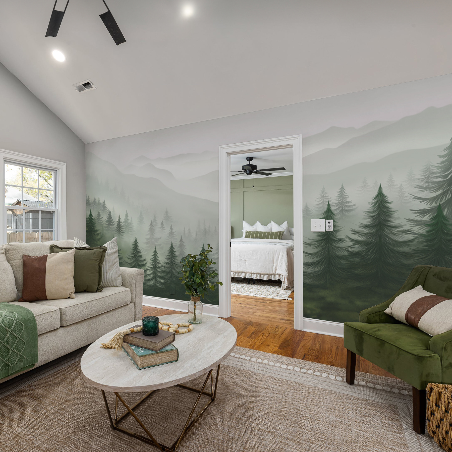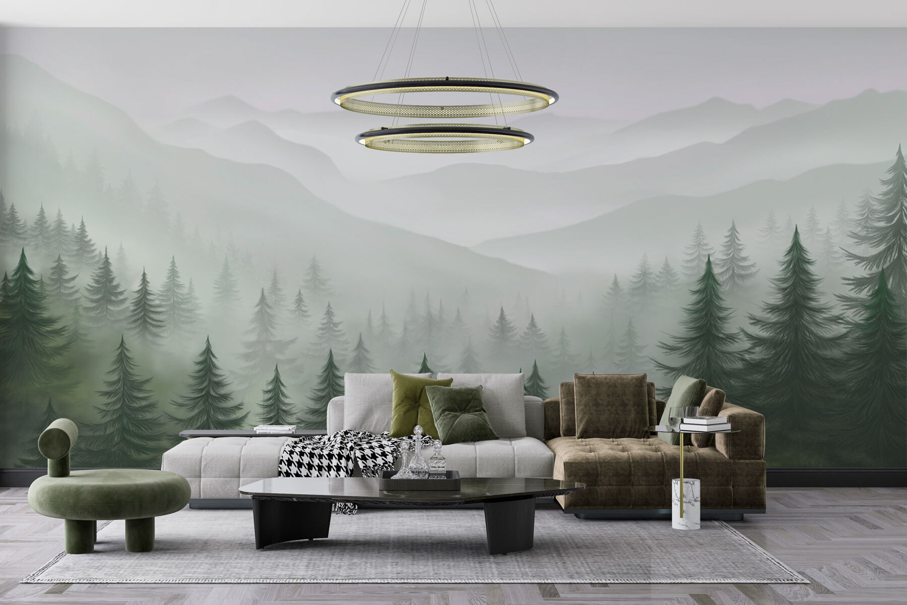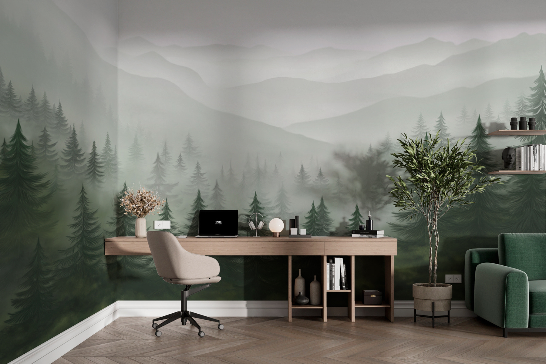 Premeňte akúkoľvek miestnosť na pokojné útočisko s touto úžasnou nástennou maľbou “Hmlistá krajina so stromami a horami”. Predstavte si, že sa uvelebíte so šálkou čaju, obklopení jemným objatím vysokých borovíc a hmlistých hôr. Je to ako vstúpiť do zasneného lesa, bez chrobákov a zablatených topánok. Jemná zelená a sivá vytvárajú upokojujúcu atmosféru, takže je ideálny pre pohodový čitateľský kútik alebo odpočinkovú spálňu. Šepká: “Zhlboka sa nadýchnite a relaxujte.” A kto to nepotrebuje? Či už ide o začiatok konverzácie alebo pokojné pozadie, táto nástenná maľba dodá nádych prírody priamo na vaše steny.