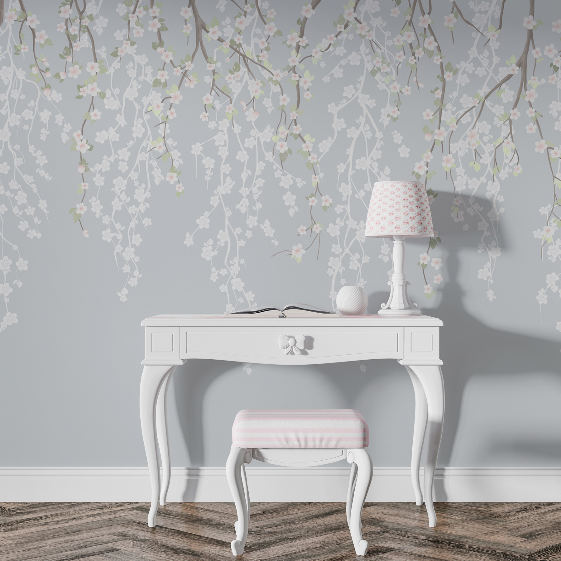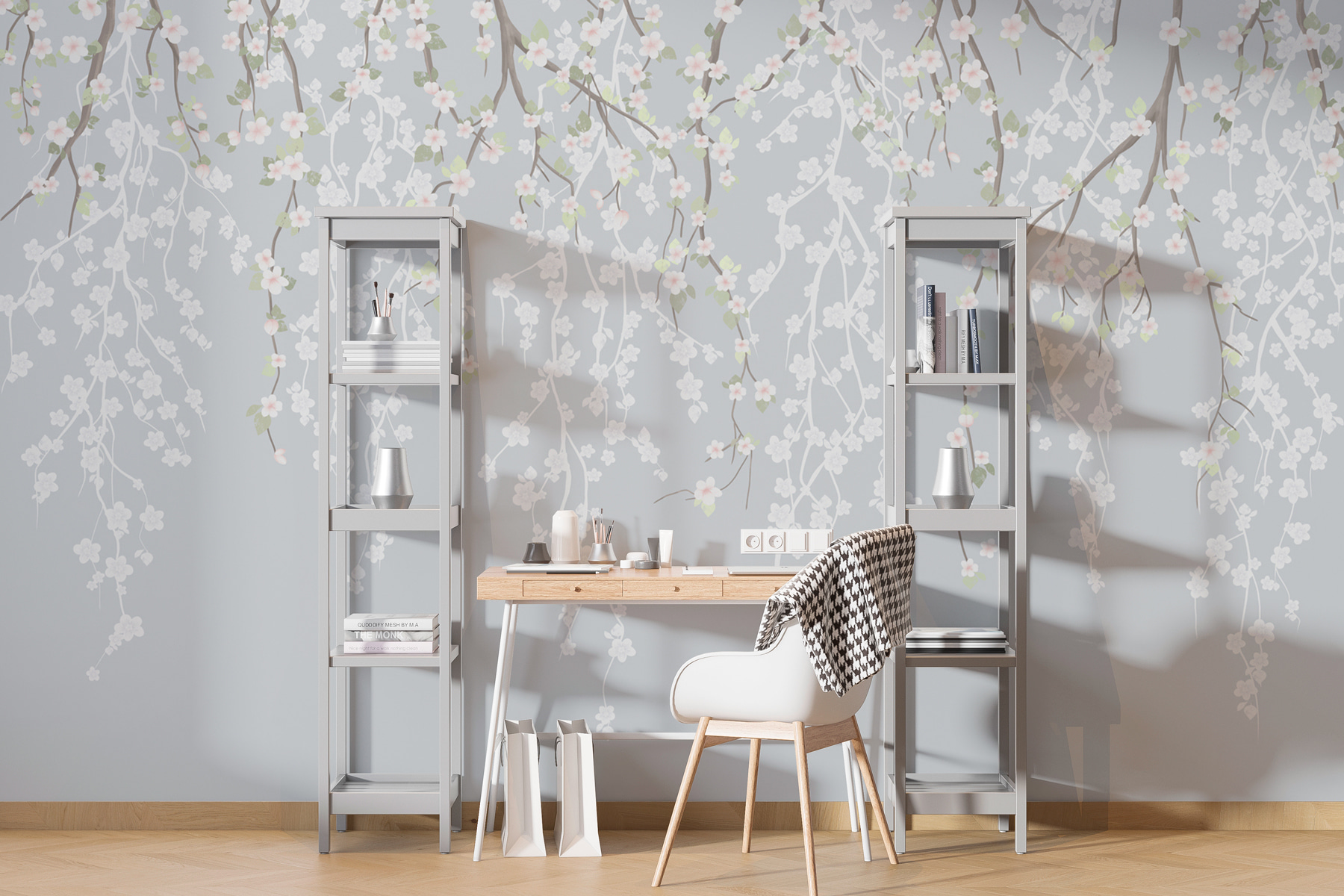 Premeňte akúkoľvek miestnosť na pokojnú oázu pomocou tejto očarujúcej nástennej maľby s jemnými bielymi kvetmi kaskádovito padajúcimi z konárov stromov. Predstavte si, že vstúpite do priestoru, ktorý okamžite pripomína pokojnú japonskú záhradu – bez potreby záhradníckych rukavíc! Táto fototapeta prináša krásu prírody do interiéru a vytvára upokojujúce pozadie ideálne na leňošenie alebo inšpiráciu pre tvorivosť. Jemná paleta farieb navodzuje pocit pokoja, takže je ťažké sa neoprieť a nesnívať. Ideálny do obývačky, spálne alebo do útulného zákutia, kde kvitnú najlepšie životné nápady. Je to ako mať kúsok prírody priamo doma – bez otravného peľu!