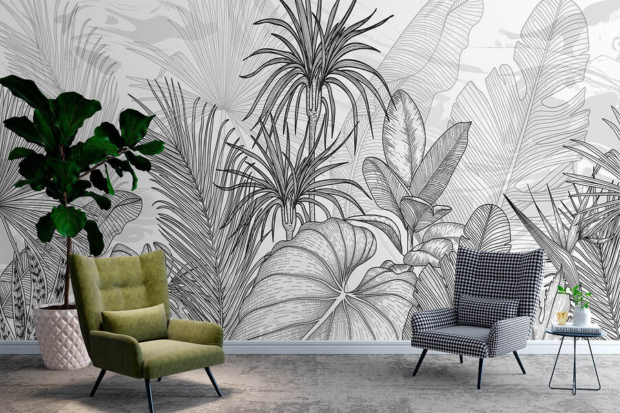 Premeňte svoj priestor pomocou tejto úžasnej čiernobielej nástennej maľby, ktorá zachytáva zložitú krásu tropických rastlín. Predstavte si, že pri každom vstupe do miestnosti vstúpite do pokojnej džungle. Tieto listnaté obrysy sú ako štýlová tajná záhrada, ktorá doplní akýkoľvek interiér – ideálne na vytvorenie útulného čitateľského kútika alebo živého jedálenského kútika. Kontrast odvážnych tvarov na jemnom pozadí nabáda k hravej predstavivosti. Nechajte sa inšpirovať nežnou krásou prírody a kto vie? Vaši priatelia si možno budú myslieť, že máte doma mini dažďový prales.