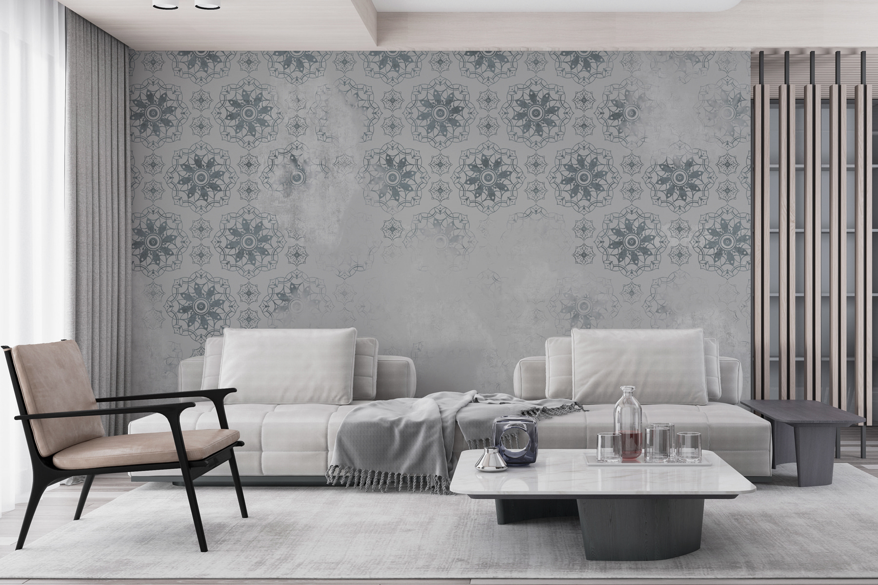Premeňte svoj priestor na pokojnú svätyňu s touto úžasnou sivou a bielou nástennou maľbou. Zložitý vzor tká gobelín pokoja, vďaka ktorému sa každá miestnosť bude cítiť ako útulné útočisko. Predstavte si, ako popíjate čaj zabalení v mäkkej prikrývke, zatiaľ čo tlmené tóny vytvárajú dokonalé pozadie pre hlboké, oduševnené rozhovory. Je to ako mať umelecké dielo, ktoré vašim stenám vdychuje život, ale nekričí o pozornosť. Navyše je univerzálny – bez problémov zapadne do moderného loftu alebo klasického domova. Kto by povedal, že nástenná maľba môže vyvolať takú radosť? Prijmite tie vibrácie!