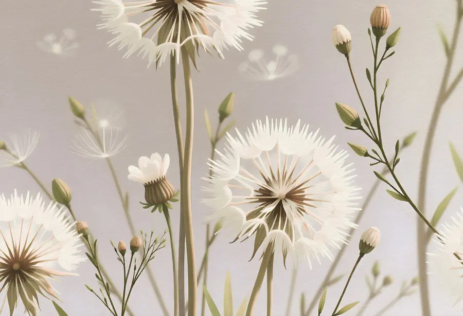 Premeňte svoj priestor pomocou nástennej maľby “Jemné kvety v jemnej palete”. Tento krásny dizajn prináša do interiéru nádych prírody, pričom obsahuje krásne púpavy a nežné kvety. Predstavte si, že sa zobudíte a privíta vás toto upokojujúce umelecké dielo – je to ako jemný šepot zo záhrady!