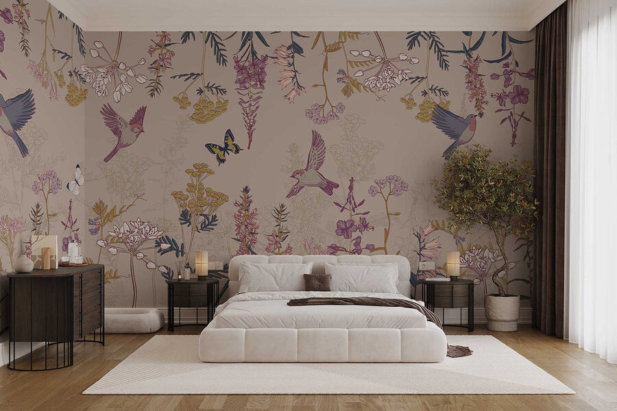Premeňte akýkoľvek priestor na pokojné útočisko pomocou tejto krásnej nástennej maľby s jemnými vtákmi a rozmarnými kvetmi. Je to ako priniesť radosť z jari priamo do vášho domova bez ohľadu na ročné obdobie vonku. Predstavte si, že popíjate rannú kávu a pritom sa pozeráte na živé motýle poletujúce medzi kvetmi – v okamihu sa prenesiete do záhradnej oázy. Jemné zemité tóny vytvárajú teplé pozadie, ktoré sa hodí do každej miestnosti, takže je ideálny pre útulné zákutia alebo jednu stenu, ktorá si žiada trochu lásky. Je to šik inšpirovaný prírodou s nádychom hravej elegancie – kto by to nechcel?
