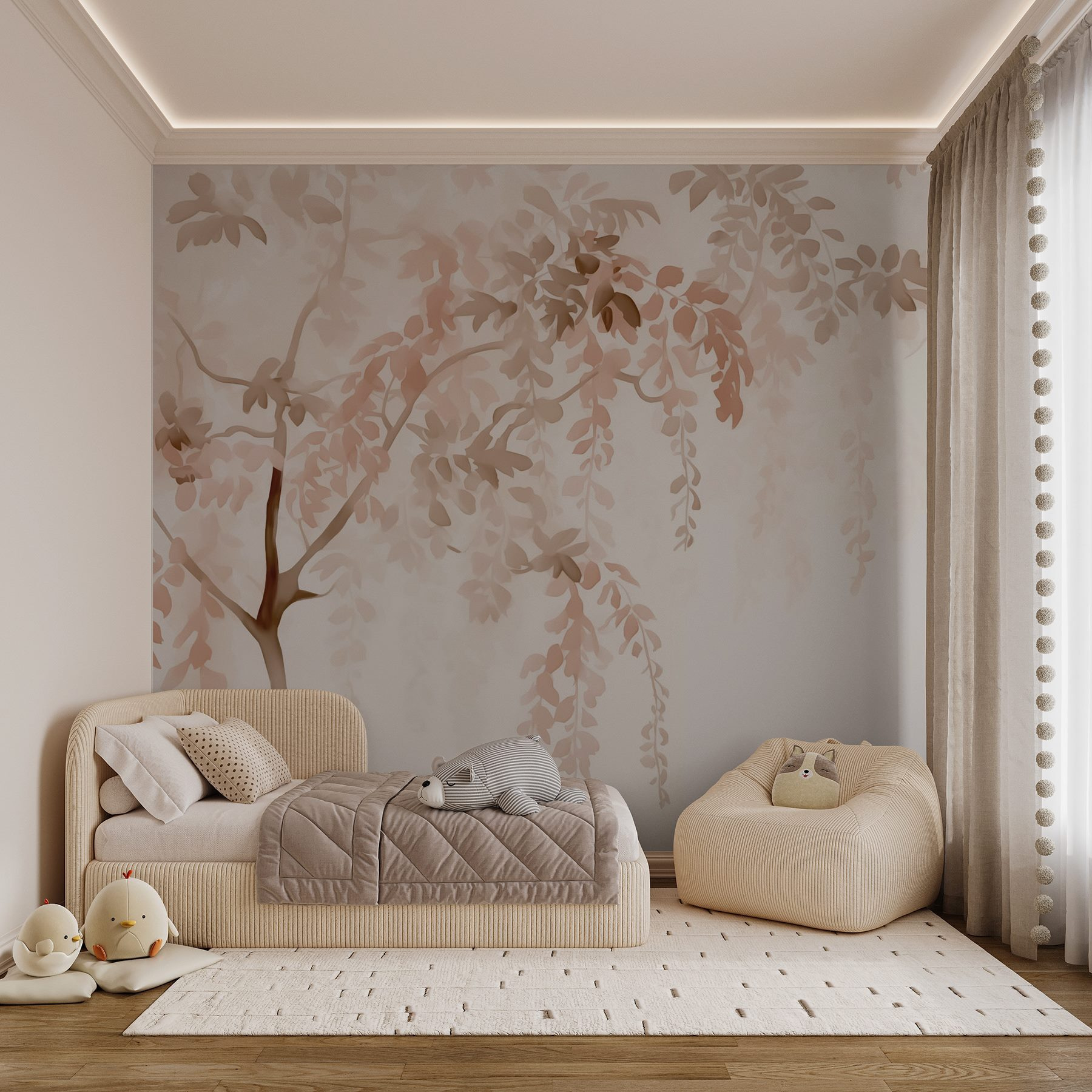 Premeňte svoj priestor na pokojné útočisko pomocou nástennej maľby “Vetva stromu s listami”. Predstavte si, že pri každom vstupe do miestnosti vstúpite do pokojného, zasneného útočiska. Jemné akvarelové tóny tejto nástennej maľby sa bez námahy prelínajú ako šepot prírody, ktorý sa otiera o vaše steny. Je to ako pozvať do interiéru jemný vánok – len bez rizika, že stratíte svoj obľúbený klobúk!