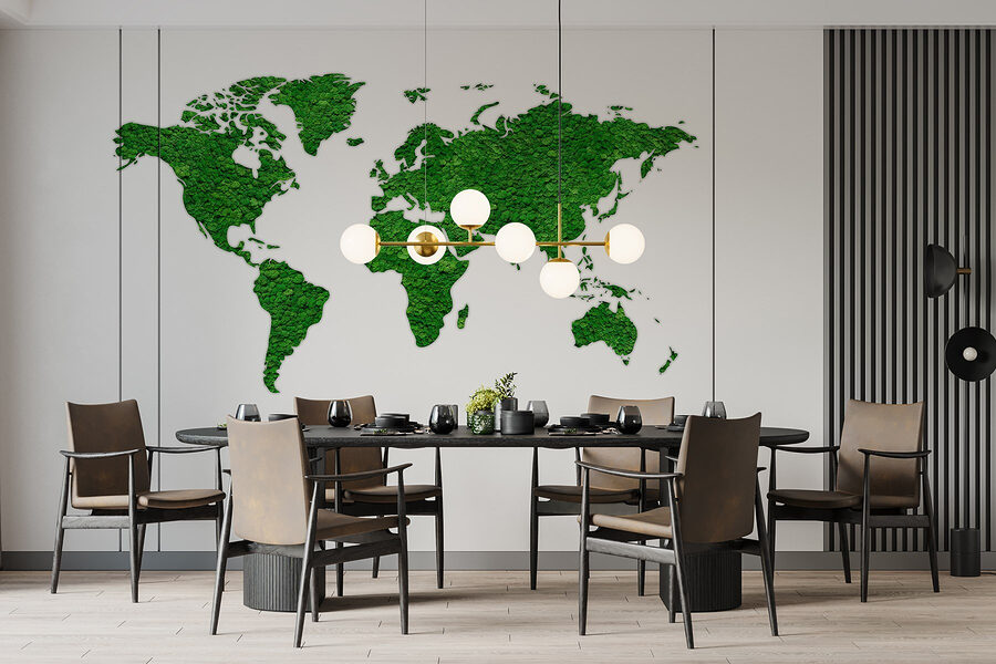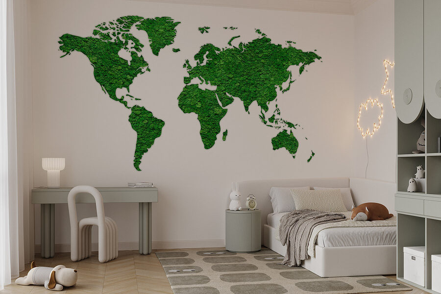 Premeňte svoj priestor pomocou tejto úžasnej nástennej maľby s mapou sveta, ktorá je celá vytvorená zo sviežich zelených rastlín. Je to ako preniesť si kúsok prírody do interiéru – bez potreby zalievania! Predstavte si, že sa uvelebíte v miestnosti, kde sú kontinenty vytvorené zo živej zelene. Vzbudzuje to zvedavosť a konverzáciu, čo je ideálne pre momenty typu “kde že je to miesto?”. Navyše vyžaruje upokojujúcu atmosféru, ako hlboký nádych čerstvého vzduchu. Či už v obývacej izbe alebo v kancelárii, táto nástenná maľba určite inšpiruje k putovaniu. Kto by povedal, že dekor môže byť taký dobrodružný?