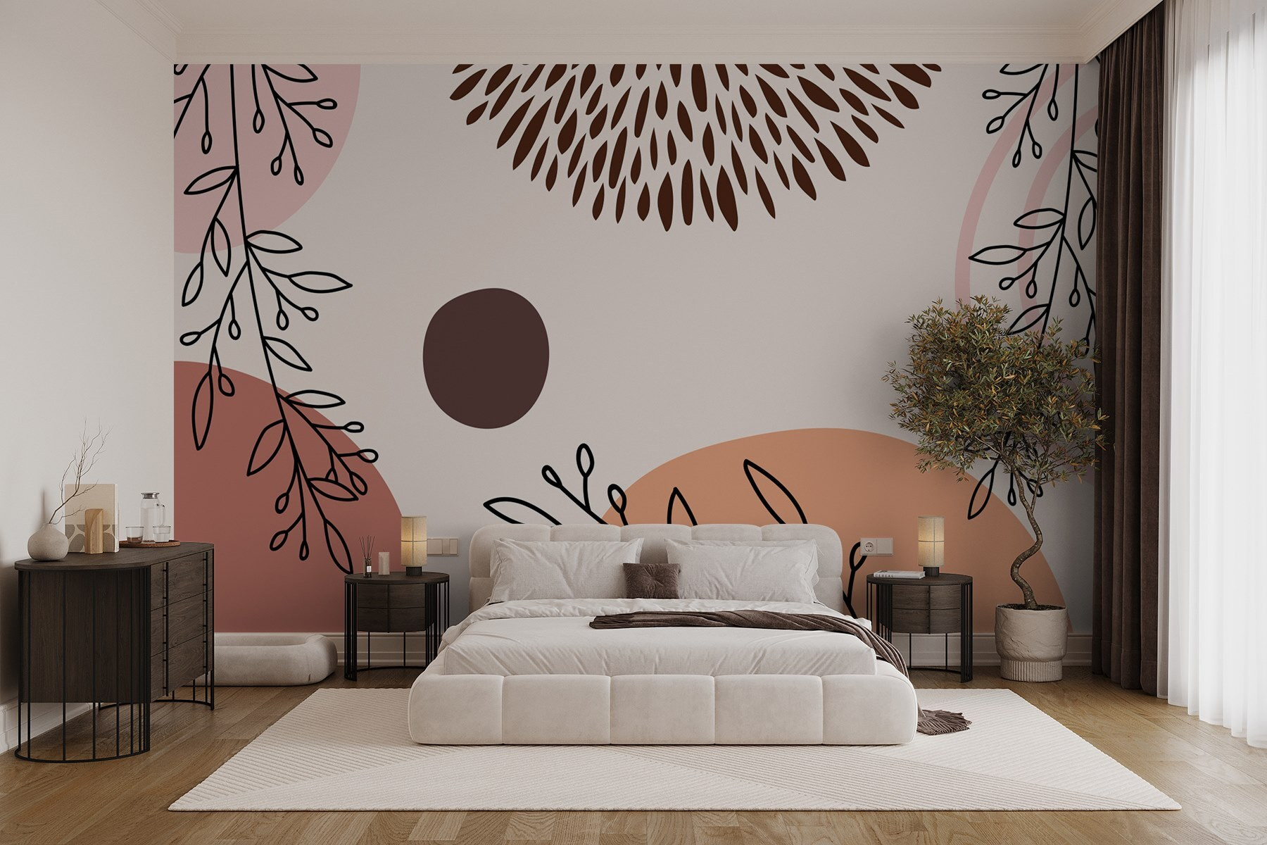 Premeňte nudnú stenu na žiarivú oázu s touto nádhernou “Nástennou maľbou so vzorom kvetov a kruhov”. Predstavte si to – teplé odtiene a hravé tvary spolu tancujú a vytvárajú útulnú atmosféru, vďaka ktorej sa aj váš gauč bude cítiť trochu slávnostnejšie. Je to ako mať v interiéri záhradu bez toho, aby ste museli čokoľvek zalievať.