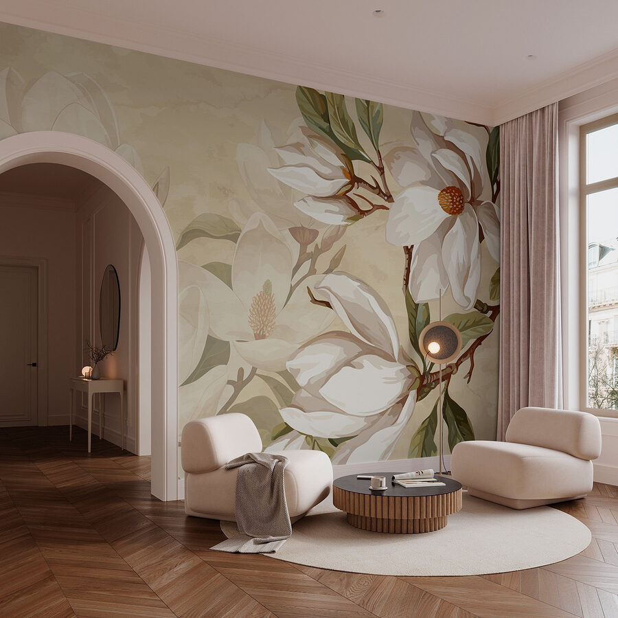 Premeňte svoj priestor na pokojnú oázu s “Jemnými kvetmi v jemných tónoch”. Táto úžasná fototapeta prináša jemný šepot prírody priamo do vášho domova. Predstavte si, že sa prebúdzate s jemnou eleganciou rozkvitnutých magnólií, ktorých krémové okvetné lístky a svieže zelené listy vytvárajú upokojujúcu atmosféru. Či už ide o obývaciu izbu, spálňu, alebo dokonca útulný kútik, táto nástenná maľba zahalí steny do jemného objatia. Je to ako pozvať do interiéru jemný záhradný vánok. Táto nástenná maľba je ideálna pre tých, ktorí zbožňujú nádych pokoja a štýlu, a každý deň v nich vyvolá radosť a trochu inšpirácie. Kto by sa nechcel cítiť, akoby bol len krok od pokojnej japonskej záhrady?