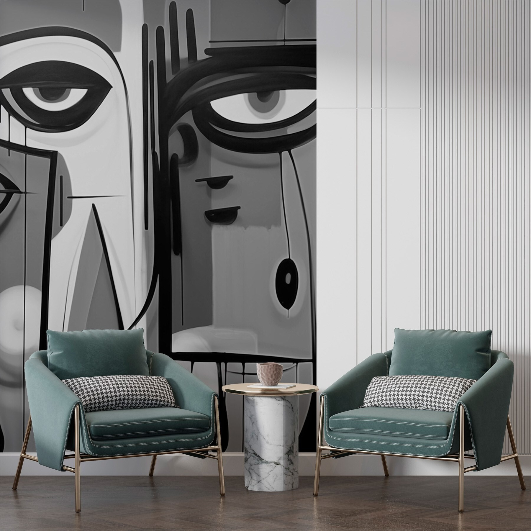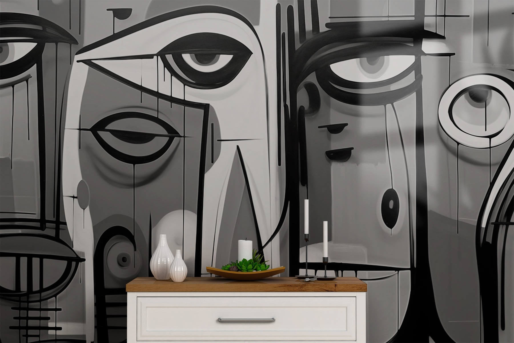 Premeňte svoj priestor pomocou tejto výraznej čiernobielej nástennej maľby s podmanivými tvárami, ktoré akoby nazerali do vášho sveta. Je to ako rozhovor s umením – plný emócií a intríg. Predstavte si to: vojdete do svojej izby a bác! Tieto výrazné tváre vás vtiahnu dovnútra, vzbudia vo vás zvedavosť a možno aj úsmev. Perfektne sa hodia do obývačky alebo kreatívneho zákutia, pretože dodávajú vrstvu hĺbky bez toho, aby sa všetky farby uchádzali o pozornosť. Navyše je to fantastický lámací nástroj pre každého, kto sa zastaví. Kto by nechcel uvažovať o príbehoch, ktoré sa skrývajú za týmito intenzívnymi pohľadmi? Dokonale moderné a bez námahy elegantné!