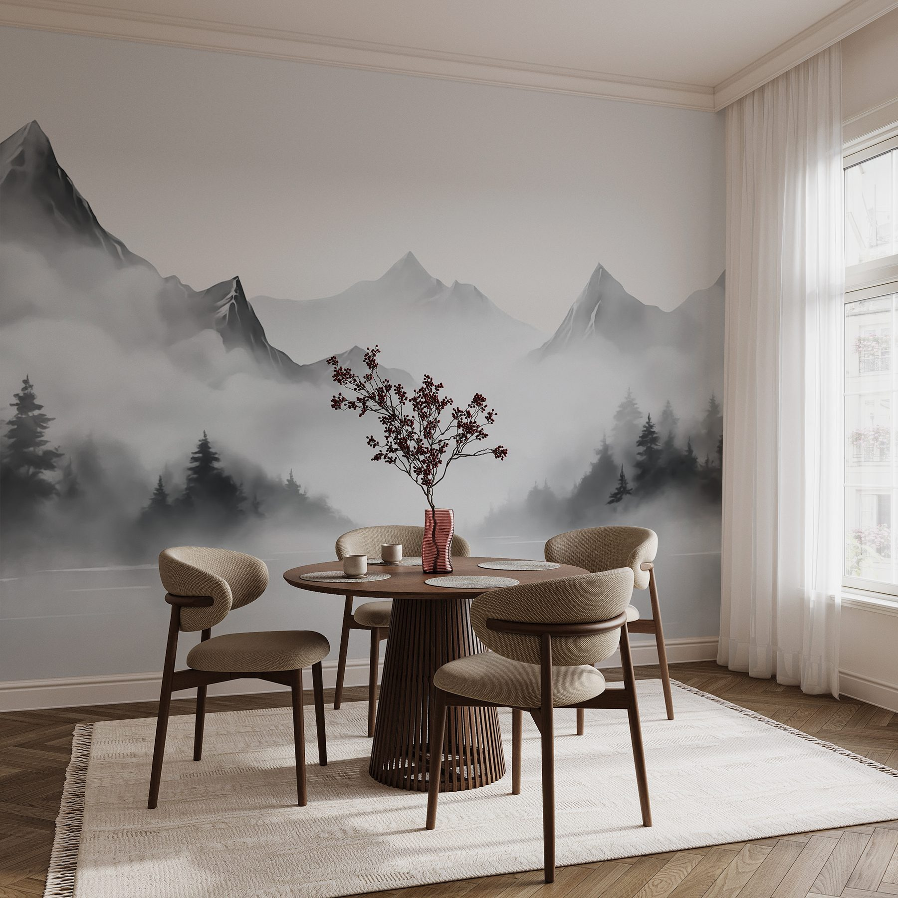 Predstavte si, že vstúpite do útulnej chaty, kde sa nad majestátnymi horami valí jemná hmla. Táto nástenná maľba s názvom “Mlžná horská krajina” vnesie do vášho priestoru túto atmosféru a premení obyčajný priestor na niečo magické. Jemná zmes tlmených tónov zahalí vašu miestnosť do tepla, ako objatie od prírody, ale bez zablatených čižiem. Je ideálny do obývačky, spálne alebo aj do tichého čitateľského kútika. Len si predstavte, ako popíjate čaj, stratení v dobrej knihe, zatiaľ čo pokojný výhľad šepká relaxáciu. Je to ako mať vlastný kúsok veľkej prírody, bez otravných chrobákov. Vďaka príťažlivému kúzlu tejto nástennej maľby sa každý deň budete cítiť ako na malom úteku.