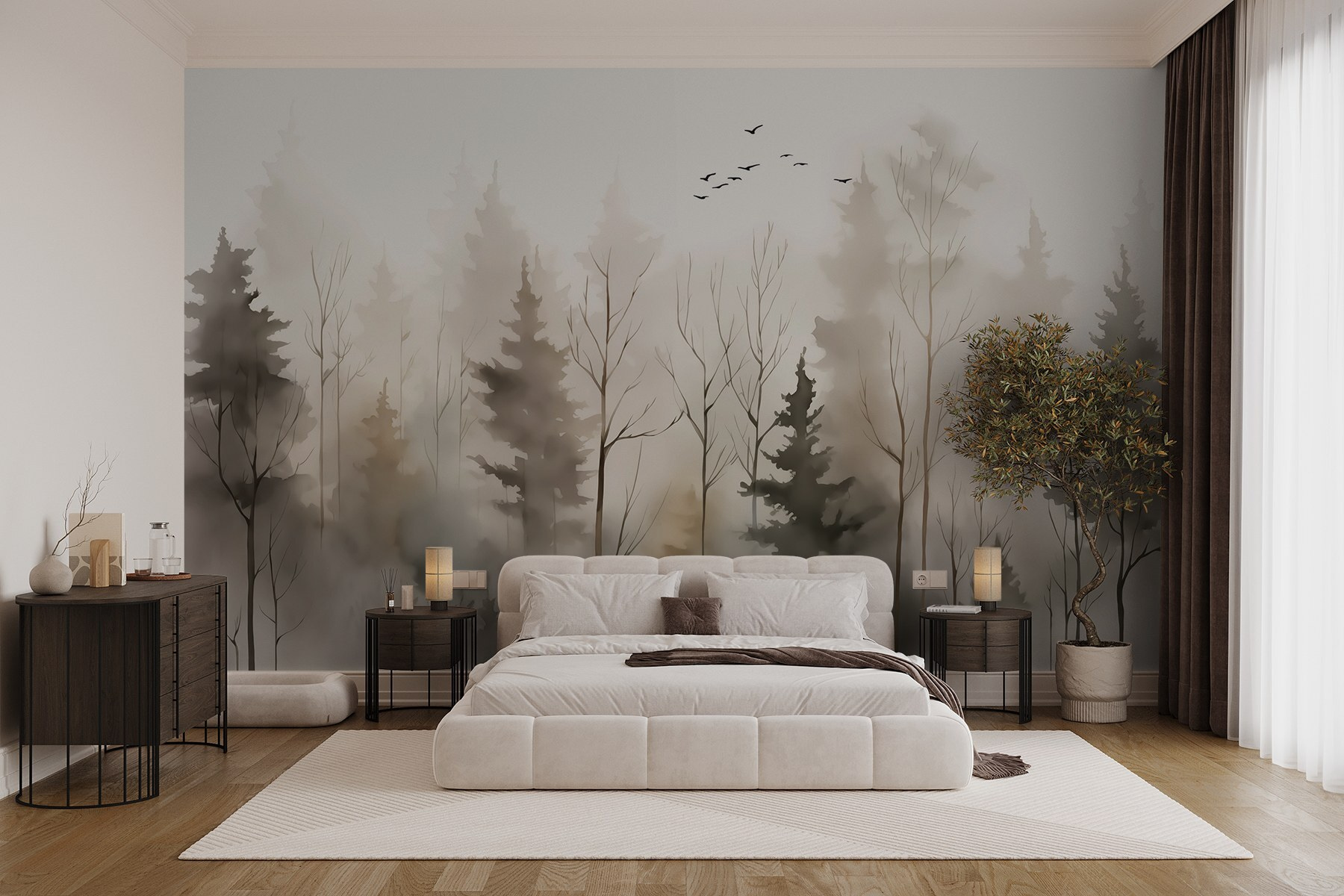 S nástennou maľbou “Skupina stromov v hmle” premeníte akýkoľvek priestor na pokojnú lesnú krajinu. Predstavte si, že sa uvelebíte vo svojej obývačke a jemné tlmené tóny vás budú nabádať k odpočinku po dlhom dni. Táto nástenná maľba šepká pokoj a zahalí vaše steny do jemnej krásy prírody – samozrejme, bez komárov!