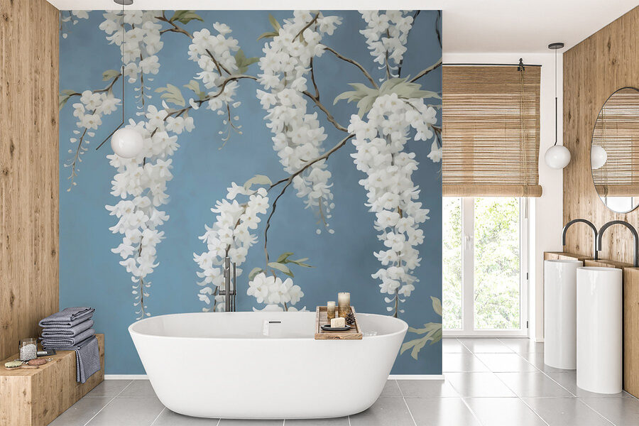Premeňte jednoduchú stenu na pokojné útočisko s touto úžasnou nástennou maľbou s bielymi kvetmi, ktoré sa ladne kaskádovito vlnia na jemnom modrom pozadí. Je to ako priniesť kúsok prírody do interiéru – bez otravného peľu! Predstavte si, že ráno popíjate kávu, dovnútra prúdi slnečné svetlo a vy máte pocit, že sedíte pod rozkvitnutým stromom. Jemná elegancia kvetov dodáva každému priestoru šarm, vďaka čomu sa bude cítiť príjemnejšie. Perfektne sa hodí do obývacích izieb, spální alebo aj do útulných čitateľských kútikov; šepká sladký pokoj. Navyše je skvelým podnetom na konverzáciu – kto by sa rád nerozprával o takomto krásnom umeleckom diele na svojej stene?