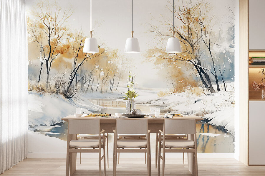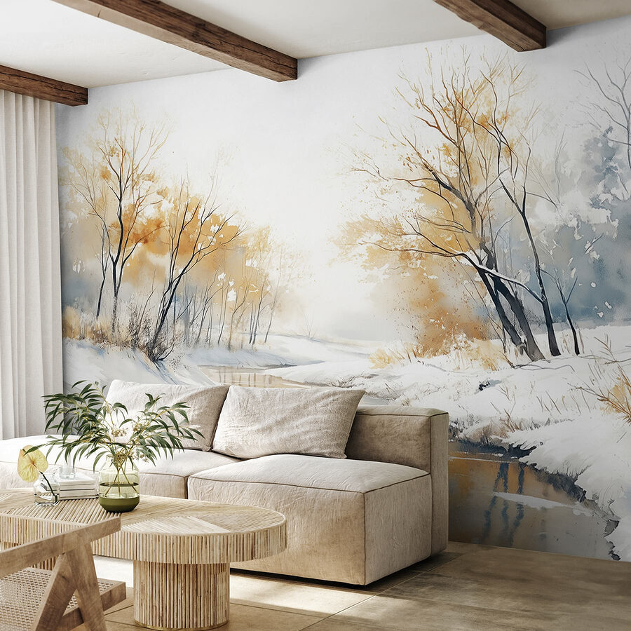 Predstavte si, že zakaždým, keď vojdete do svojej izby, vstúpite do zasneženej krajiny. Táto fototapeta “Rieka so snehom a stromami” zachytáva túto pokojnú atmosféru ako príjemná deka v chladný deň. Jemné akvarelové odtiene sa jemne prelínajú a vytvárajú pokojnú scénu rieky orámovanú krehkými stromami, ktoré sú celé poprášené vrstvou snehu.