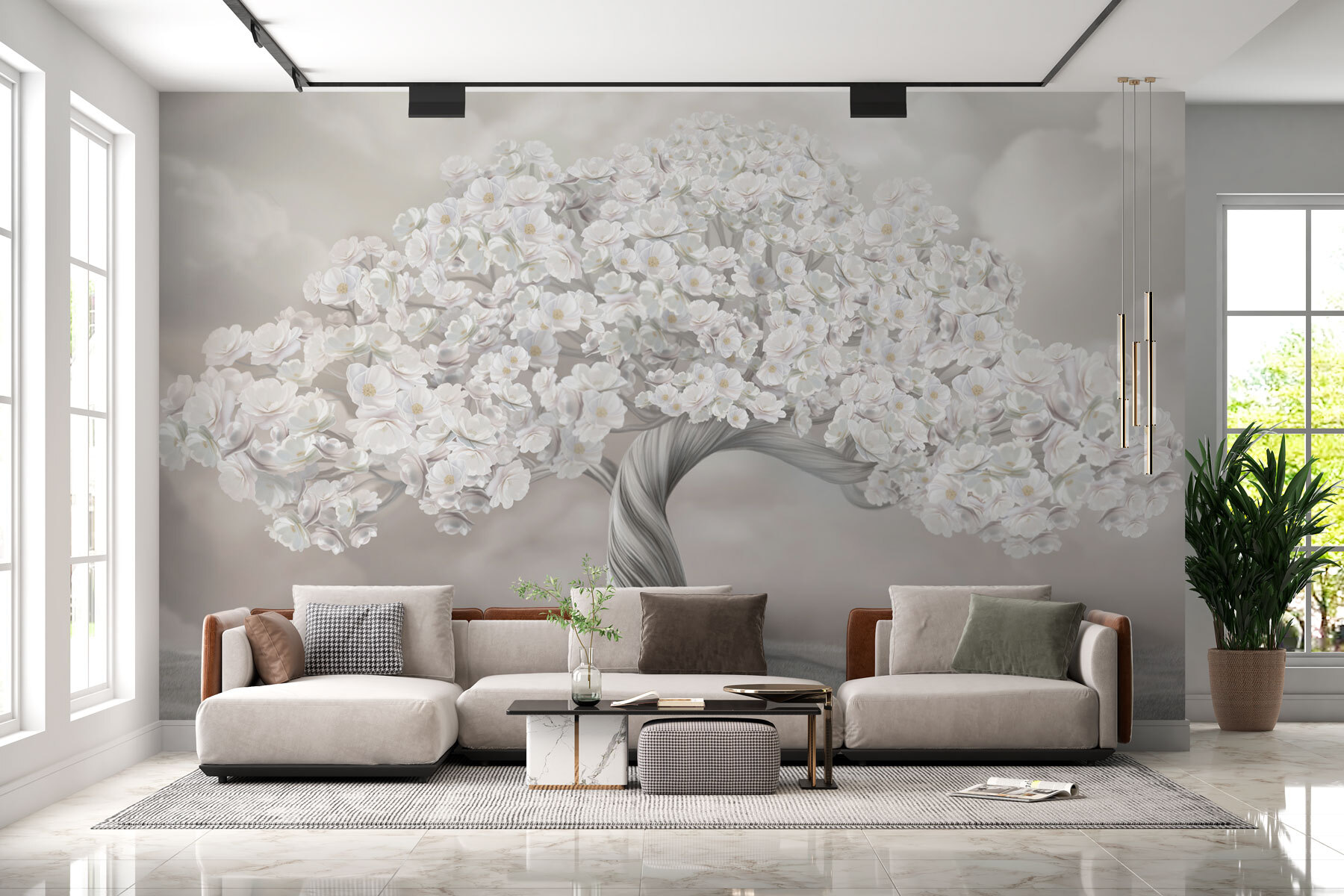 Pomocou nástennej maľby “Strom s bielymi kvetmi” premeníte každú miestnosť na pokojné útočisko. Tento okúzľujúci dizajn predstavuje pôvabne zakrútený strom, ktorý oplýva jemnými bielymi kvetmi a evokuje pokojnú atmosféru japonskej záhrady. Predstavte si, ako popíjate rannú kávu zaliatu jemným svetlom a pritom si vychutnávate kúsok prírody priamo na stene.