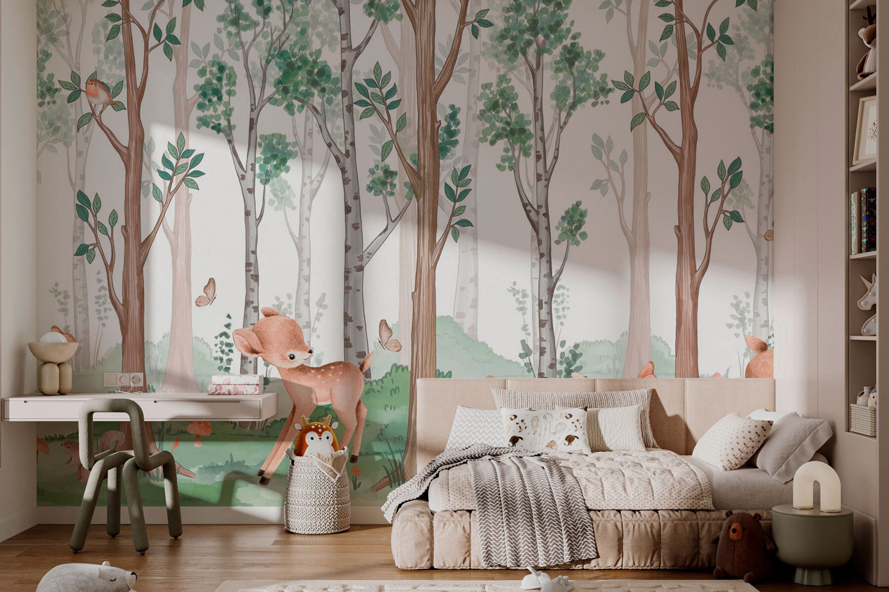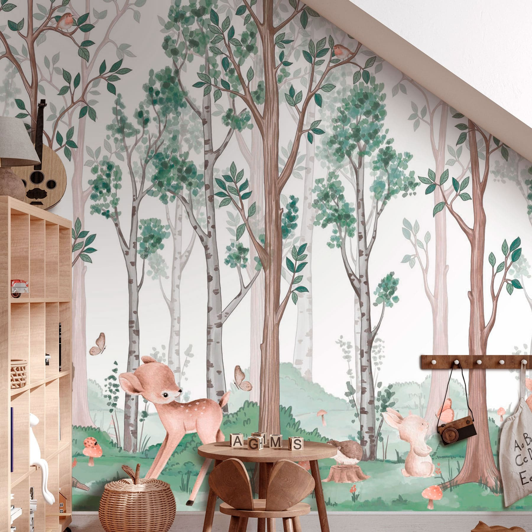 Premeňte svoje steny na pokojný lesný únik s touto očarujúcou fototapetou s hravými zvieratkami a vysokými šepkajúcimi stromami. Predstavte si jemný vánok šuchotajúci lístím, ako zvedavé srnky a šantiace zajačiky skúmajú svoj lesný domov. Každý pohľad na jemné farby tejto nástennej maľby vás možno unesie na pokojnú poľanu, kde sa všetky starosti rozplynú ako ranná hmla. Ideálna do útulnej obývačky alebo rozmarnej detskej izby, pozýva prírodu dovnútra a podnecuje radosť a predstavivosť. Je to ako mať kúsok lesa priamo doma – samozrejme, bez chrobákov a blata! Vážne, môže byť dekorácia ešte útulnejšia?