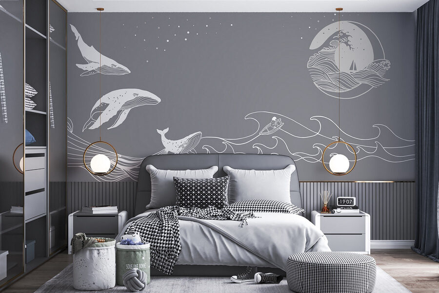 Ponorte sa do rozmarného sveta s touto nástennou maľbou s majestátnou veľrybou a osamelým mužom, ktorý sa plaví oceánom. Akoby miestnosť obmývala jemná vlna pokoja, ktorá každému pripomenie obrovské životné dobrodružstvá. Predstavte si, ako popíjate čaj a pritom sa pozeráte na tieto pôvabné veľryby – nevyvoláva to len radosť? Jemné odtiene a plynulé línie vytvárajú pokojnú atmosféru, ktorá je ideálna na snívanie o pobytoch na pláži alebo útulných večeroch. Je to nádherný tanec prírody, pri ktorom sa každý hosť bude pýtať, kde ste našli taký očarujúci kúsok!