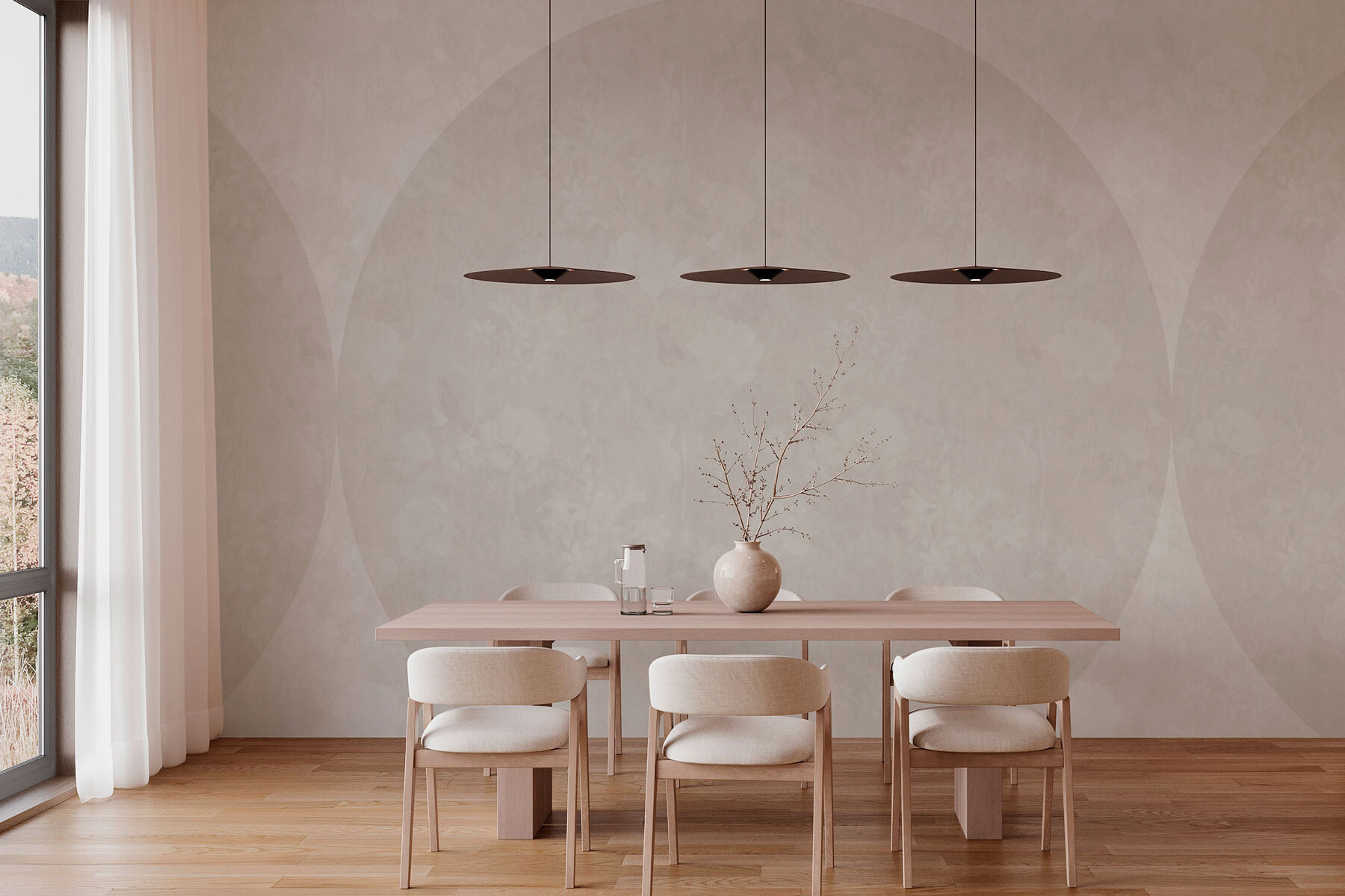Premeňte akýkoľvek priestor na upokojujúcu oázu pomocou nástennej maľby “Biely kruh s kvetmi”. Predstavte si to: mäkké, jemné kvety uzavreté v jemných kruhoch, ktoré do vášho každodenného života našepkávajú eleganciu a šarm. Je to ako pozvať pokojnú záhradu priamo k vám domov.