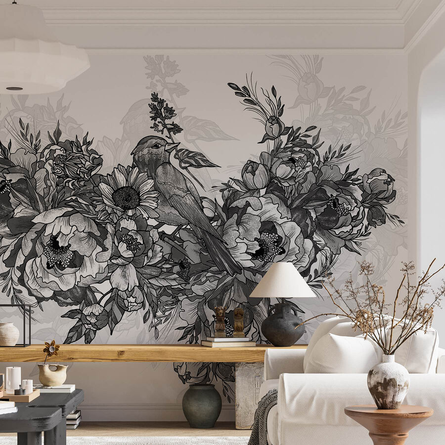 Premeňte akúkoľvek stenu na zasnené útočisko pomocou tejto nástennej maľby vtáka sediaceho medzi žiarivými kvetmi. Vnesie do interiéru nádych prírody, ktorý je ideálny pre dni, keď sa vonku nechce spolupracovať. Predstavte si, že sa uvelebíte s knihou a budete mať pocit, že sa s vami vták delí o svoje tajomstvá a šepká vám príbehy o jari a slnku. S pivonkami a slnečnicami víriacimi okolo je to ako mať mini záhradu priamo doma. Či už je to v obývacej izbe alebo v tichom kútiku, táto nástenná maľba dodáva šmrnc a teplo a mení každodenné priestory na vaše osobné útočisko. Presne to, čo zaženie šeď!