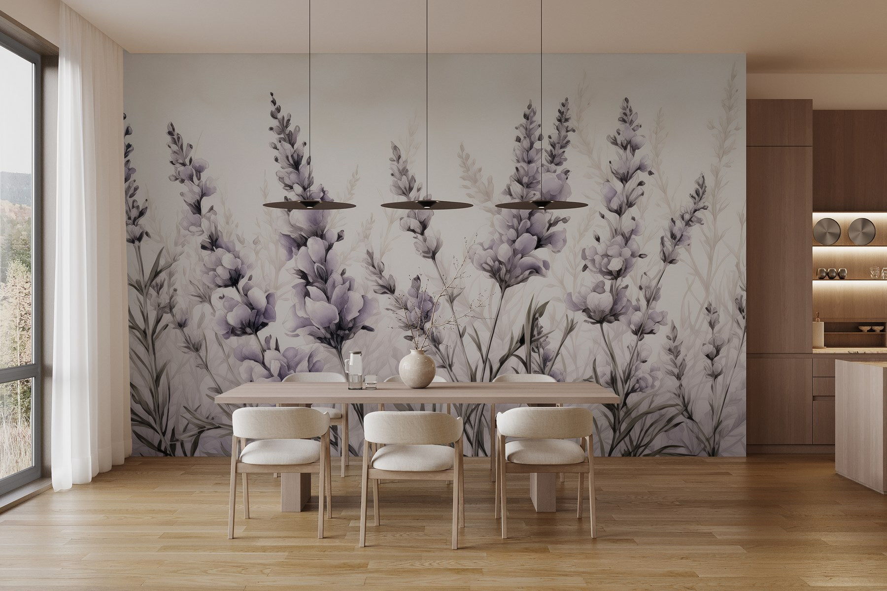 Premeňte akúkoľvek miestnosť pomocou tejto úžasnej nástennej maľby s jemnými kvetmi a listami v zasnenom akvarelovom štýle. Predstavte si, že sa zobudíte na jemné levanduľové pole priamo vo svojom priestore – znie to čarovne, však? Je to ako preniesť pokoj prírody do interiéru bez peľových alergií. Jemné odtiene a splývavé tvary dokážu premeniť aj tú najjednoduchšiu stenu na živú malú záhradu. Táto nástenná maľba, ideálna do útulného zákutia alebo obývačky, pozýva k teplu a radosti. Kto by to bol povedal, že spleť kvetov dokáže rozžiariť deň?