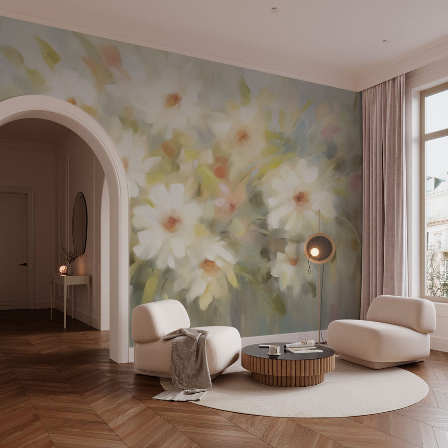 S touto zasnenou fototapetou s bielymi kvetmi premeníte akýkoľvek priestor na pokojný únik. Je to ako preniesť záhradu do interiéru bez otravného peľu. Predstavte si, že sa zobudíte na tieto jemné kvety – tieto nežné, tlmené farby sa rozlievajú po miestnosti a zahaľujú ju do útulného objatia. Ideálne pre dotyk prírody v obývacej izbe alebo dokonca upokojujúcu atmosféru v spálni. Predstavte si priateľa, ktorý vojde, zastaví sa a povie: “Páni, to je ako závan čerstvého vzduchu!” Či už ide o rannú kávu alebo večerné rozhovory, táto nástenná maľba navodí tú správnu náladu. Je bez námahy očarujúca, je to kvetinový sen, ktorý čaká, aby rozžiaril vaše steny.