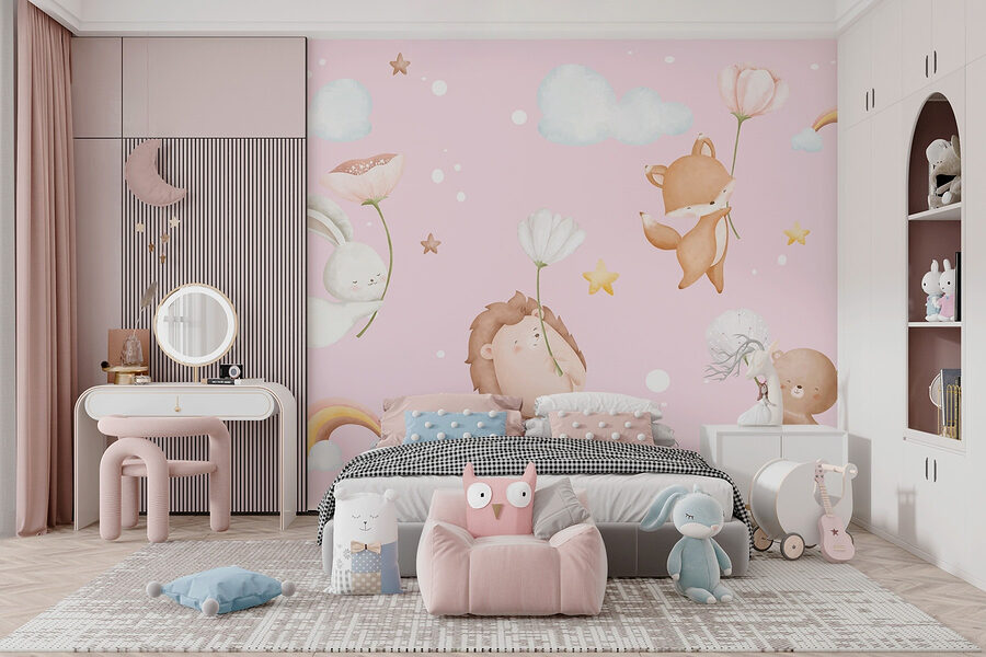 Premeňte svoj priestor na rozmarnú krajinu zázrakov s touto očarujúcou nástennou maľbou! Predstavte si útulný kútik plný jemného chichotania najmenších, ako rozkošné zvieratká – veselý zajačik a veselý medveď – držia kvety na jemnom ružovom pozadí. Je to ako nahliadnuť do hravého sna! Z každého zvieratka srší sladkosť a nadýchané obláčiky a drobné hviezdičky sú už len čerešničkou na torte. Táto nástenná maľba je ideálna do detských izieb alebo herní a možno inšpiruje k niekoľkým dobrodružstvám počas rozprávky. Kto vie, možno sa dokonca rozbehne malá tanečná párty! Je to dekorácia, ktorá rozžiari srdcia.