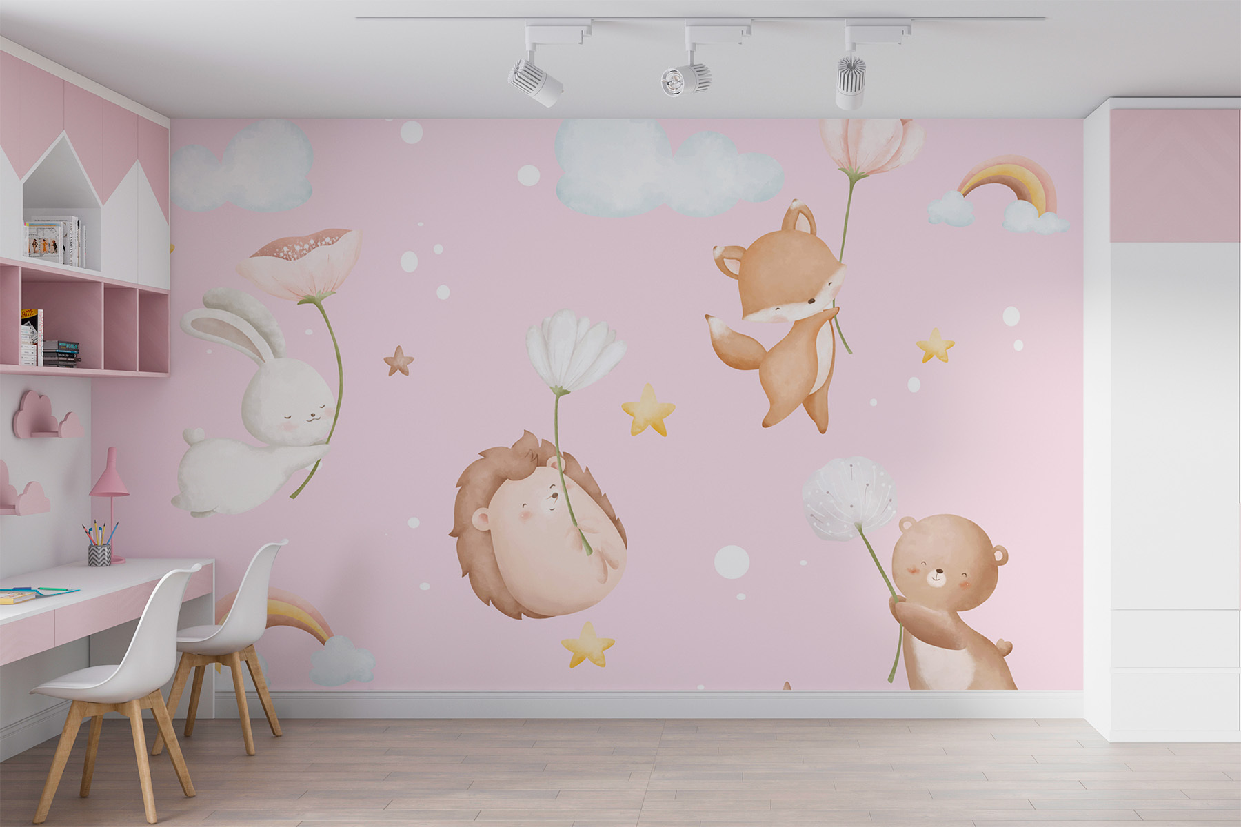 Premeňte svoj priestor na rozmarnú krajinu zázrakov s touto očarujúcou nástennou maľbou! Predstavte si útulný kútik plný jemného chichotania najmenších, ako rozkošné zvieratká – veselý zajačik a veselý medveď – držia kvety na jemnom ružovom pozadí. Je to ako nahliadnuť do hravého sna! Z každého zvieratka srší sladkosť a nadýchané obláčiky a drobné hviezdičky sú už len čerešničkou na torte. Táto nástenná maľba je ideálna do detských izieb alebo herní a možno inšpiruje k niekoľkým dobrodružstvám počas rozprávky. Kto vie, možno sa dokonca rozbehne malá tanečná párty! Je to dekorácia, ktorá rozžiari srdcia.
